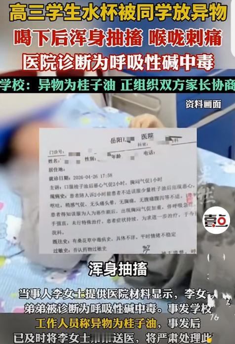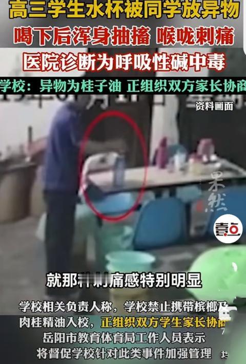 细思极恐!湖南岳阳,女子接到读高三弟弟学校打来的电话,说他喝下同学往他杯子里放的东西进了医院。女子到了医院都傻眼了:弟弟当时都讲不了话了,浑身抽搐,头痛,喉咙刺痛、烧得慌,疼得他满床打滚。医生诊断为呼吸性碱中毒。事后,校方称:学校禁止携带槟榔及肉桂精油入校,正组织双方学生家长协商。网友:这都犯法了,还协商啥?