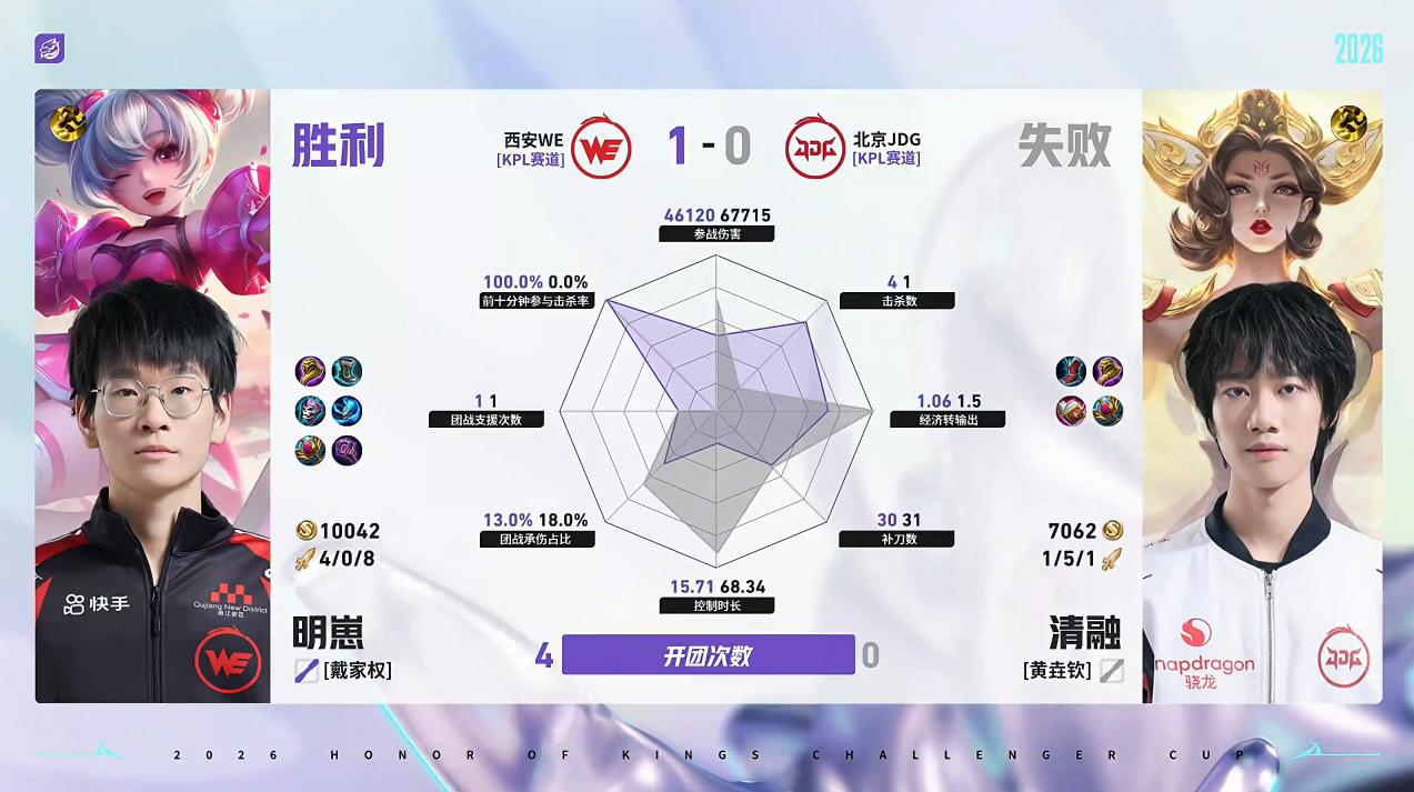 虎扑04月28日讯WE/JDG第1局数据对比:昭珏戈娅全包围小寒苍。