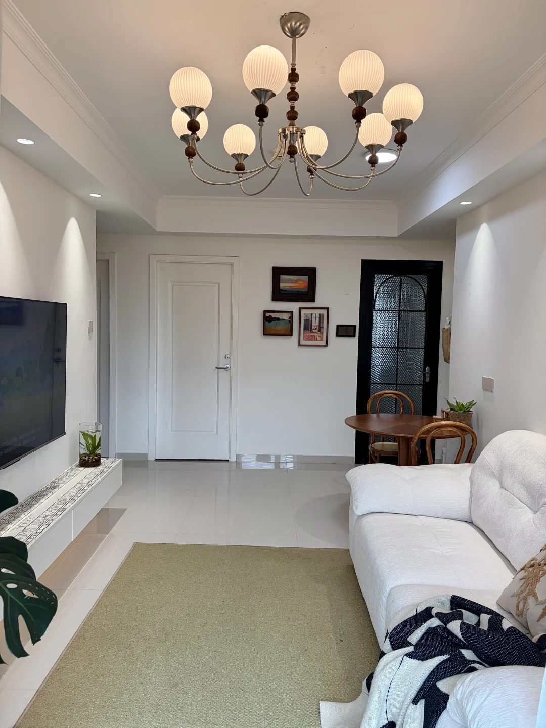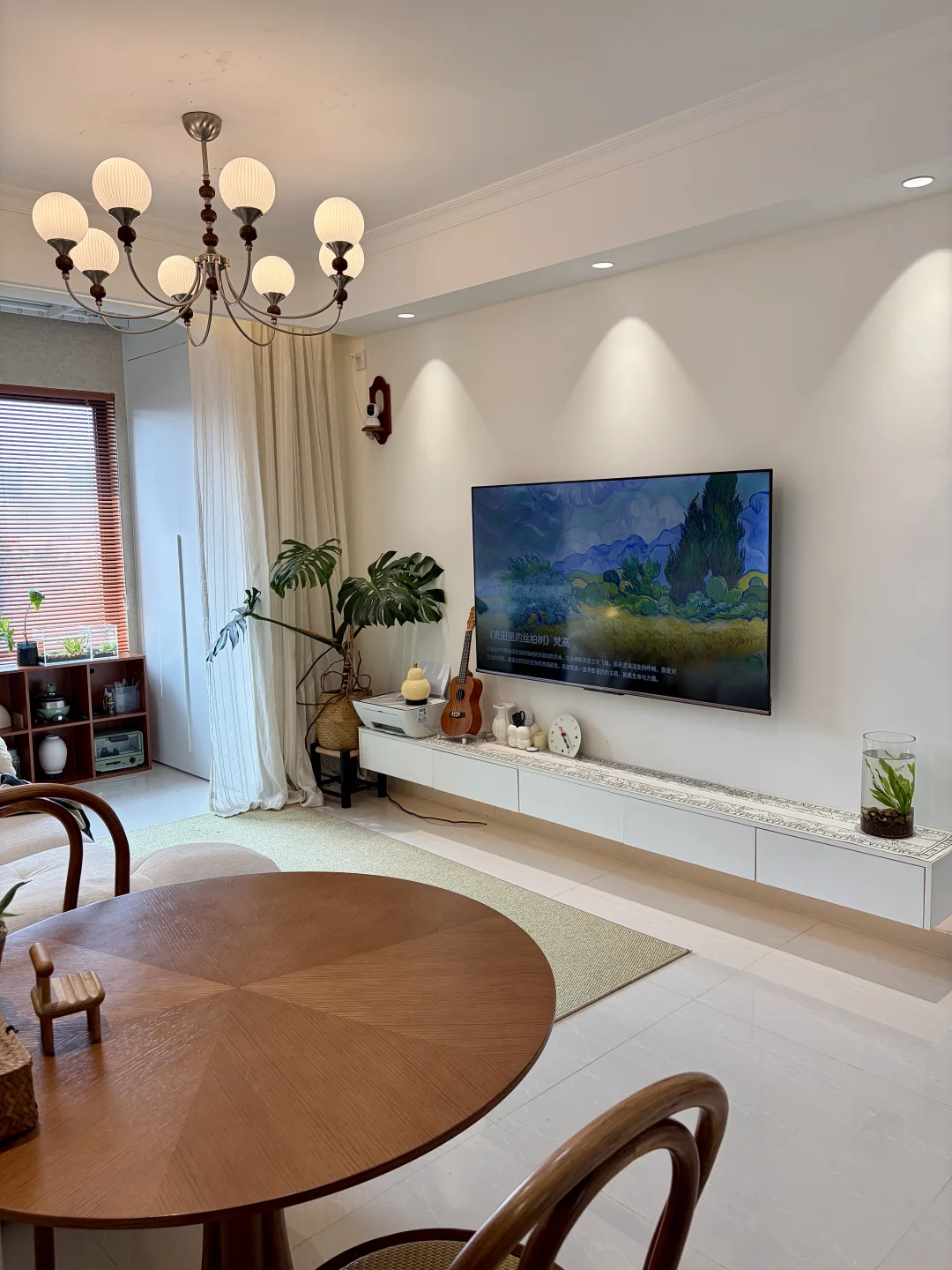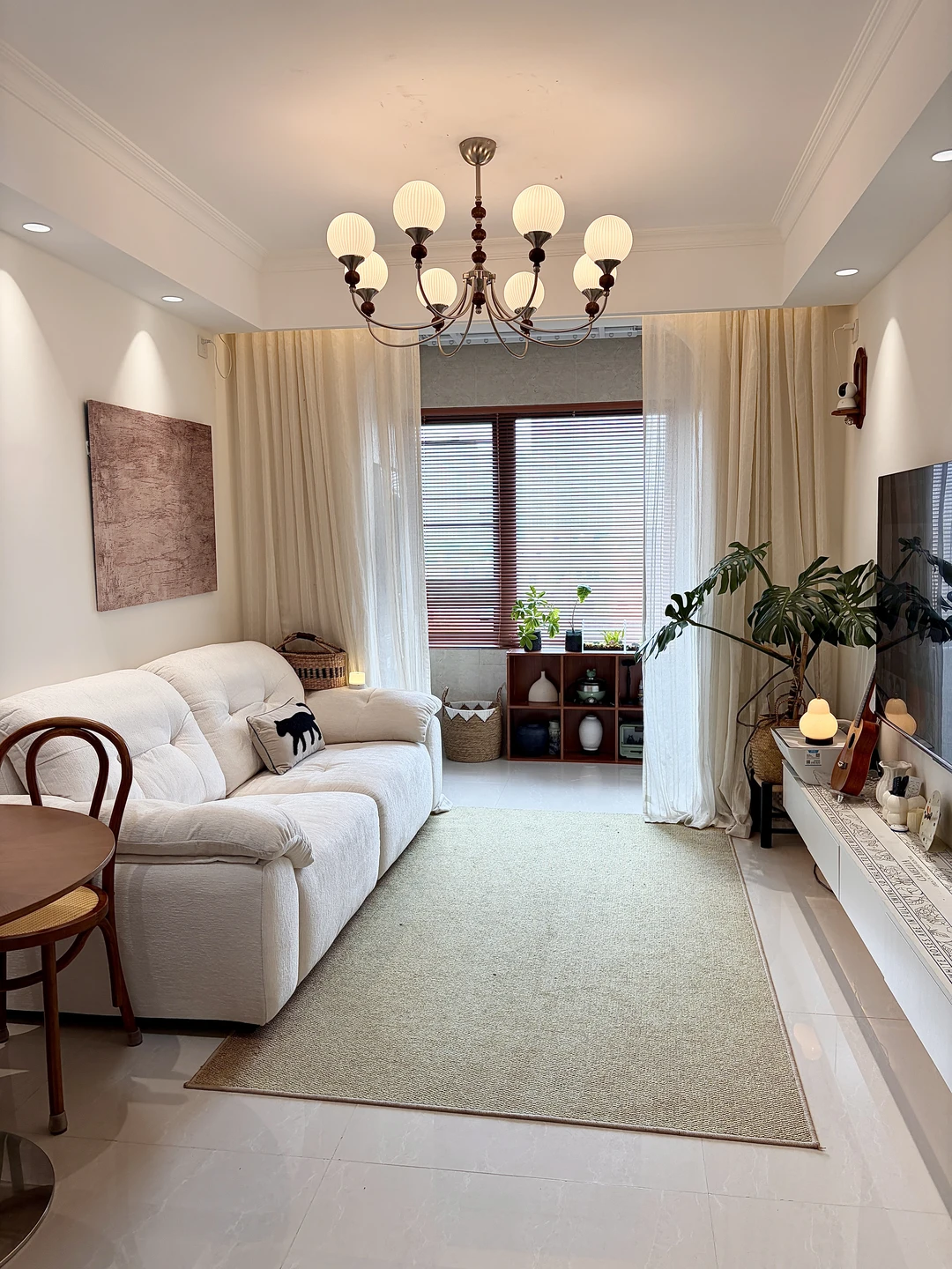 客餐厅一体,客厅开间2.85m,电视墙3.5m,搭配65寸电视+2.7m电视柜,奶白沙发温柔又显大,复古小圆桌氛围感拉满。