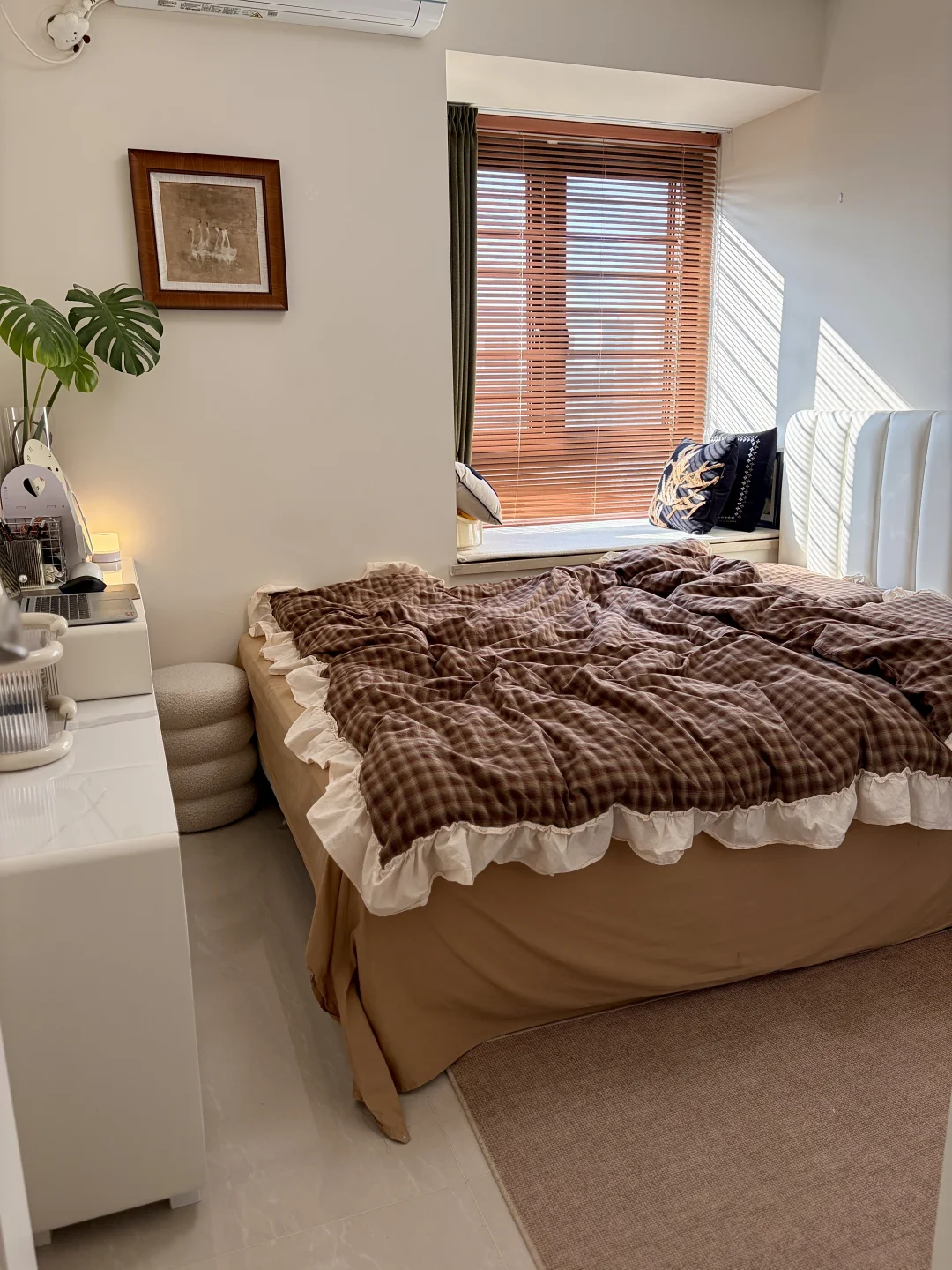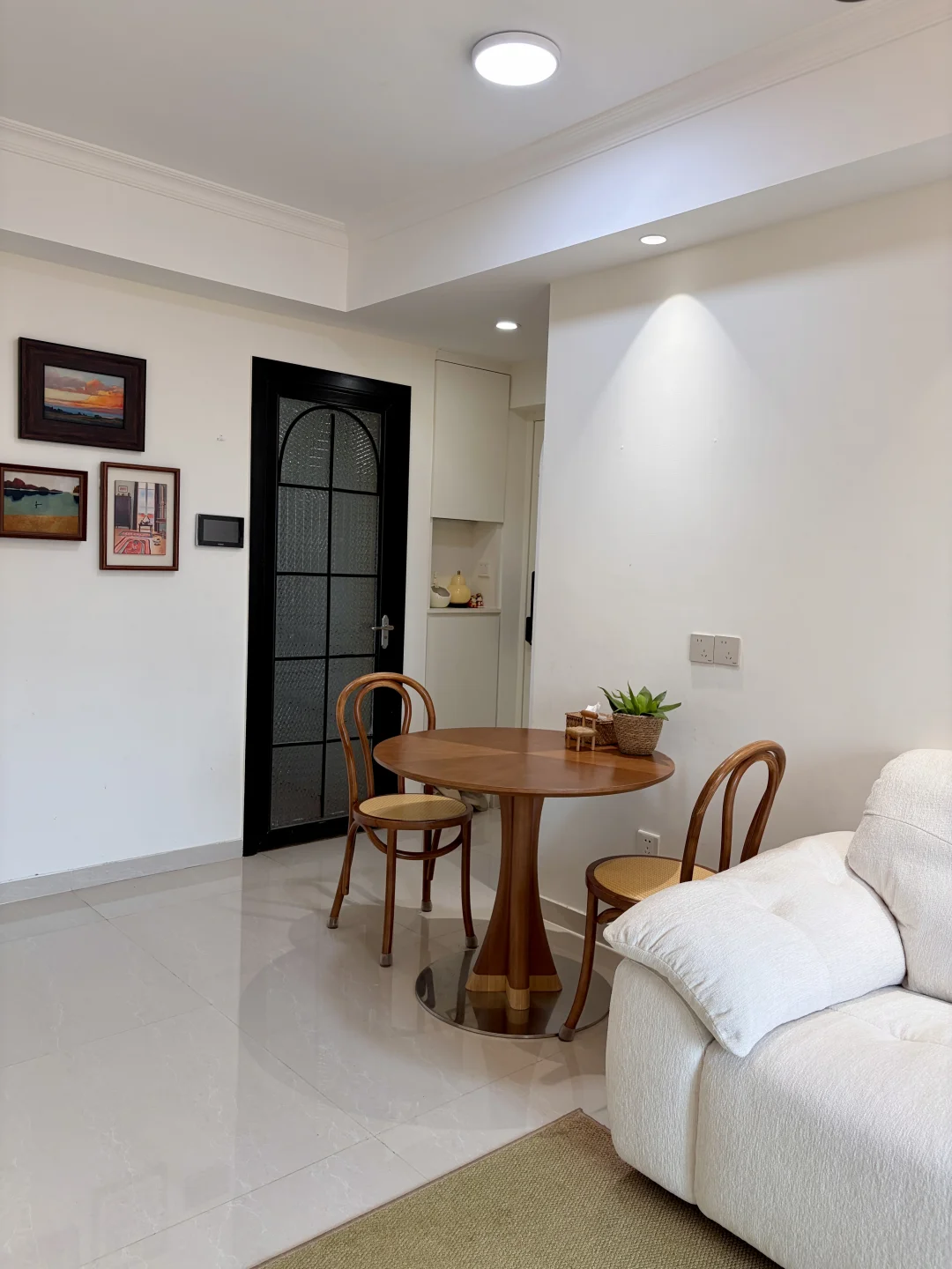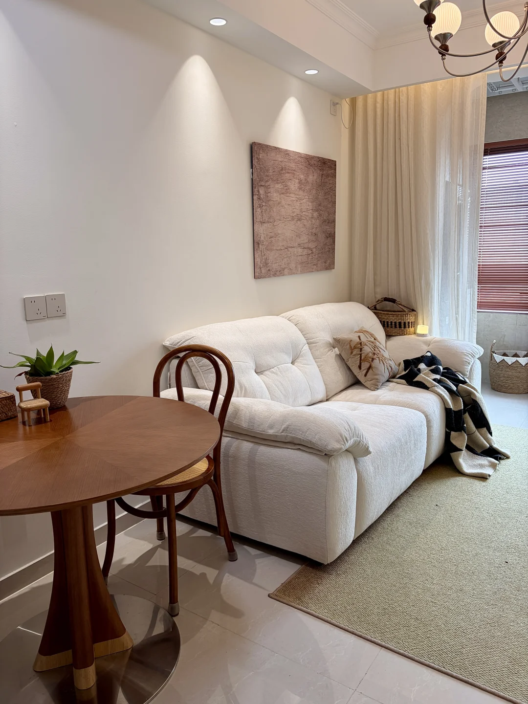客餐厅一体,客厅开间2.85m,电视墙3.5m,搭配65寸电视+2.7m电视柜,奶白沙发温柔又显大,复古小圆桌氛围感拉满。