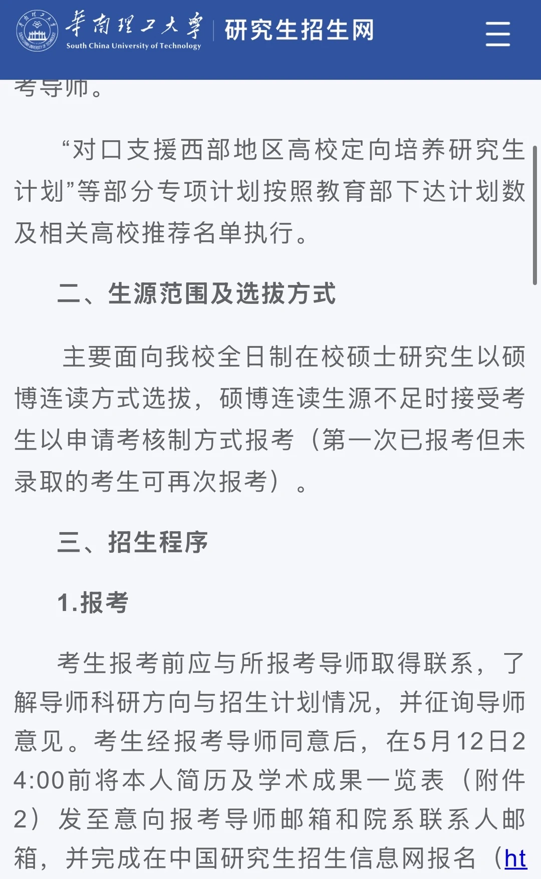 考生报考前应与所报考导师取得联系,了解导师科研方向与招生计划情况,并征询导师意见。考生经报考导师同意后,在5月12日24:00前将本人简历及学术成