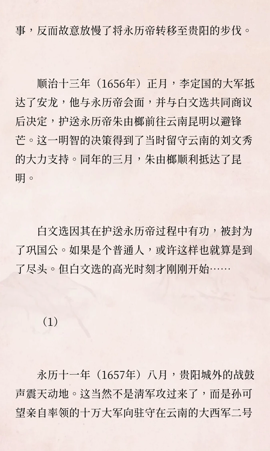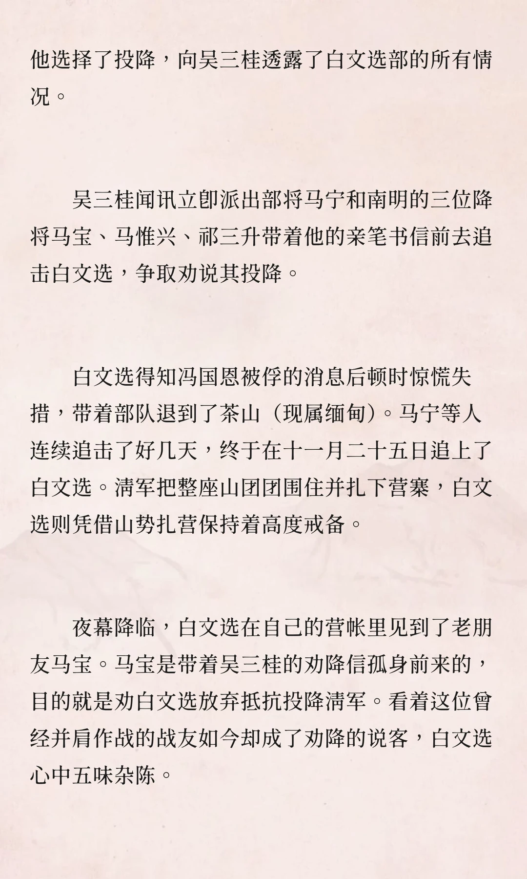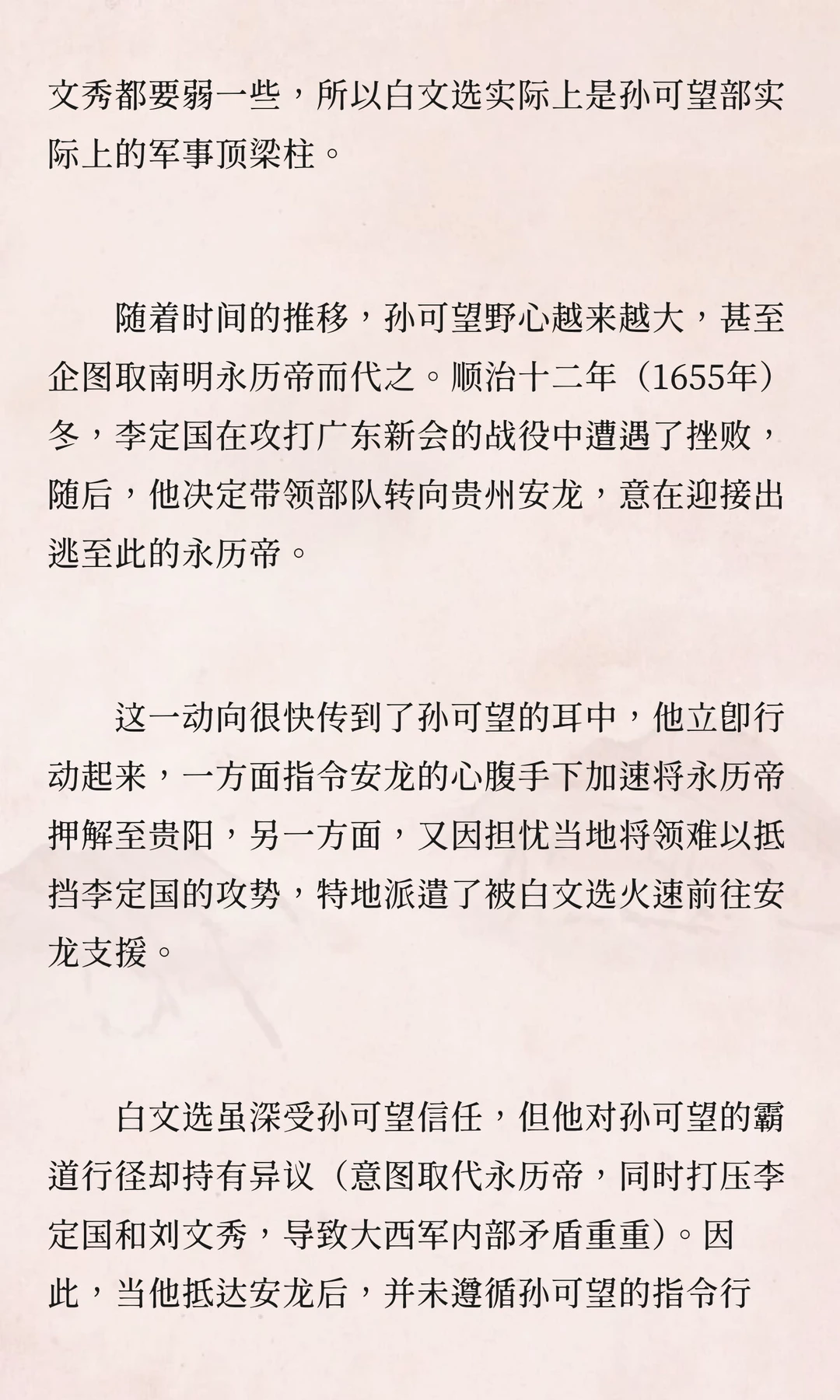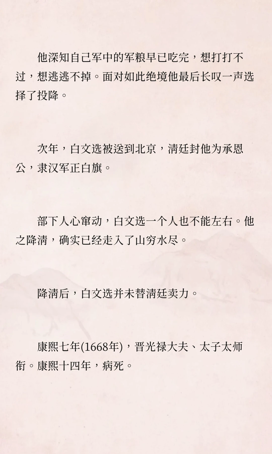白文选,陕西起义军将领,曾为大西军前军都督,后因不满孙可望野心背叛,协助李定国护送永历帝朱由榔至云南,被封巩国公。后因清军进攻,白文选投降,最终降清并获封承恩公,但未为清廷效力,晚年病逝。