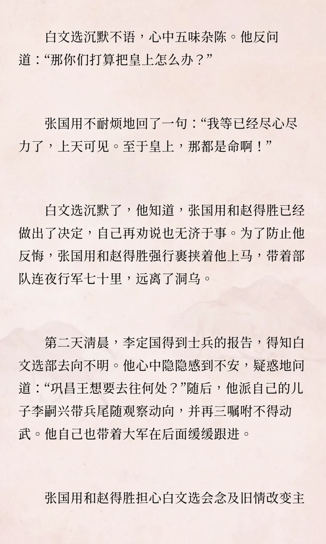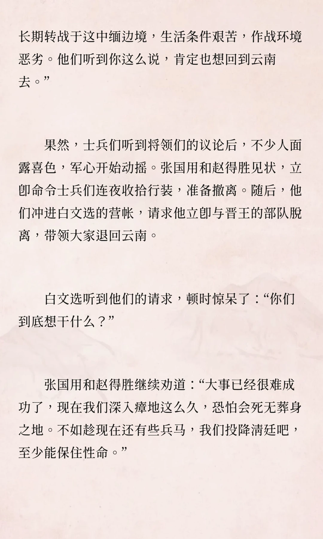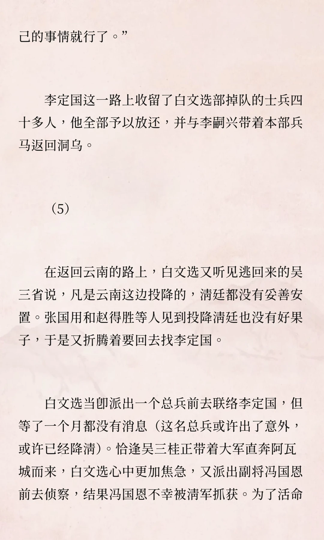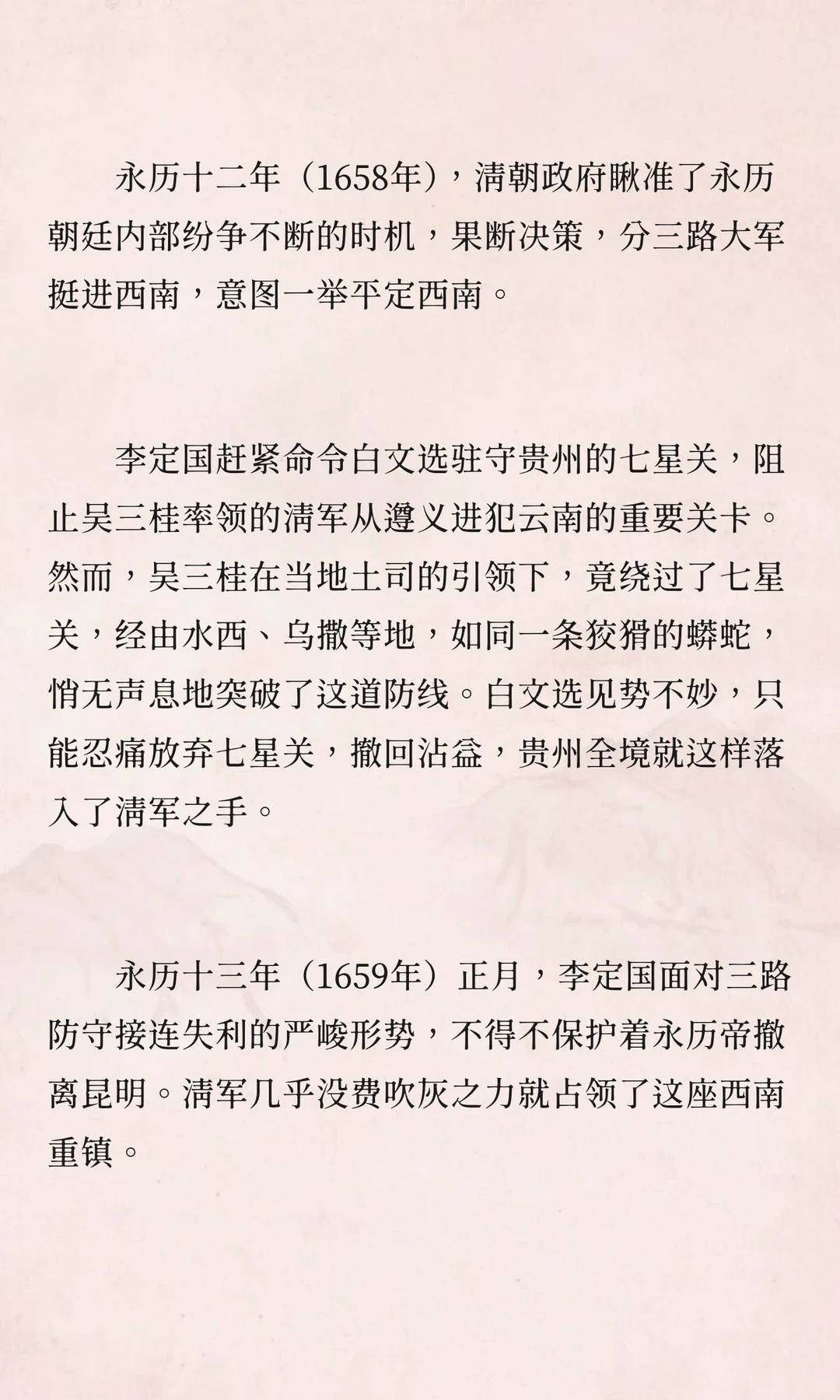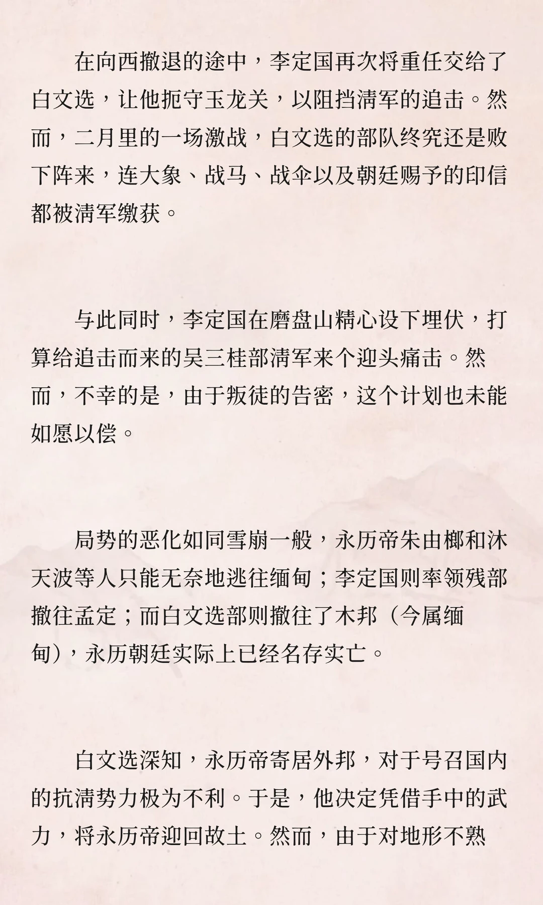 白文选,陕西起义军将领,曾为大西军前军都督,后因不满孙可望野心背叛,协助李定国护送永历帝朱由榔至云南,被封巩国公。后因清军进攻,白文选投降,最终降清并获封承恩公,但未为清廷效力,晚年病逝。