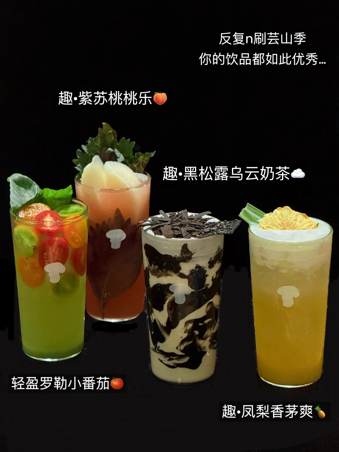 还有好看好喝的饮品🍸爱清爽选凤梨香茅爽/紫苏桃桃乐,偏爱奶味足的选黑松露乌云奶茶
