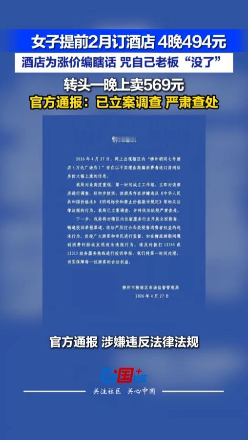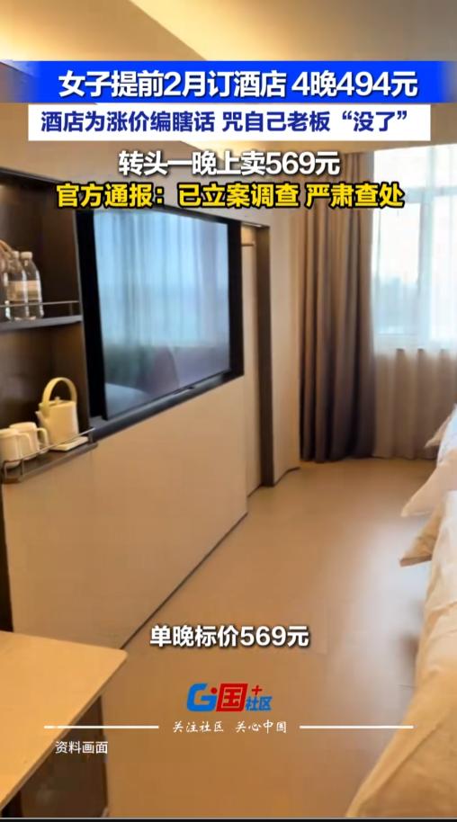 信息来源:《女子提前2月订酒店4晚494元,酒店为涨价编瞎话,咒自己老板“没了”,转头一晚上卖569元。官方通报:已立案调查,严肃查处。》国+社区