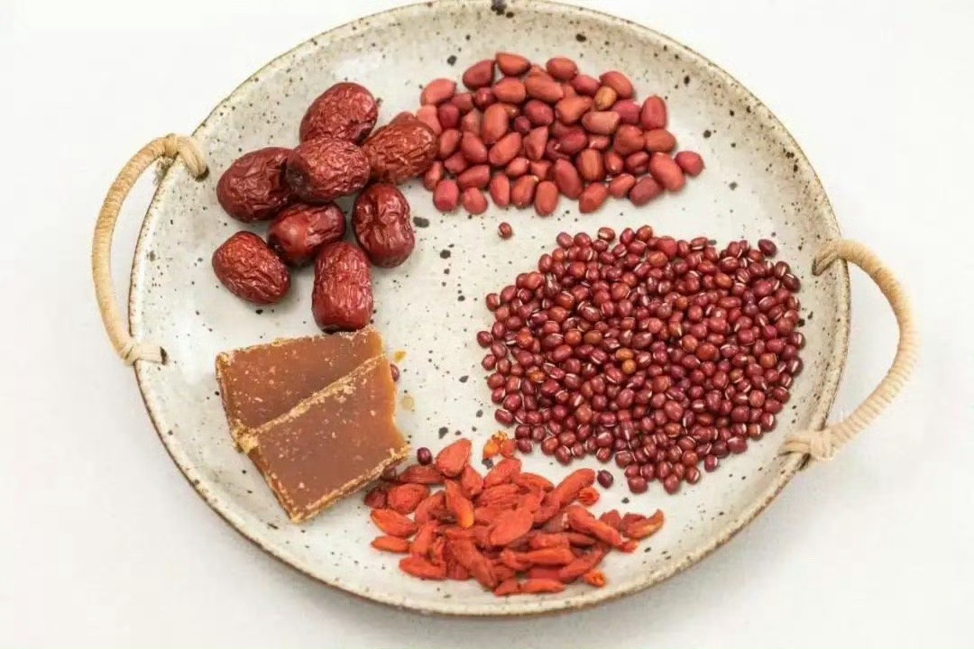 五红汤【红皮花生】:能够补脾胃之气,能达到养血止血的作用,可以促使血小板生成;【红枣】:补中益气、养血安神;【红豆】:补血养心、保健脾胃、消除水肿;【红糖】:益气补血、健脾暖胃、缓中止痛、活血化淤;【枸杞】:补肝肾,红糖益气补血、健脾暖胃五红汤做法:30克红小豆、30克枸杞、20颗红皮花生、5颗红枣、放在一起加水煮。开锅后转小火,炖40分钟。喝的时候放红糖,可以每天喝一到二次。对贫血以及化疗后白细胞减少都有效果。 五红汤”,有补血、养颜以及抗癌的功效; 适合: 1)女性;女性一般都会贫血,此汤可升血,备孕及待孕均佳; 2)放、化疗病人;因放、化疗导至血小板、白血球降低,此汤可提升。健闻登顶计划
