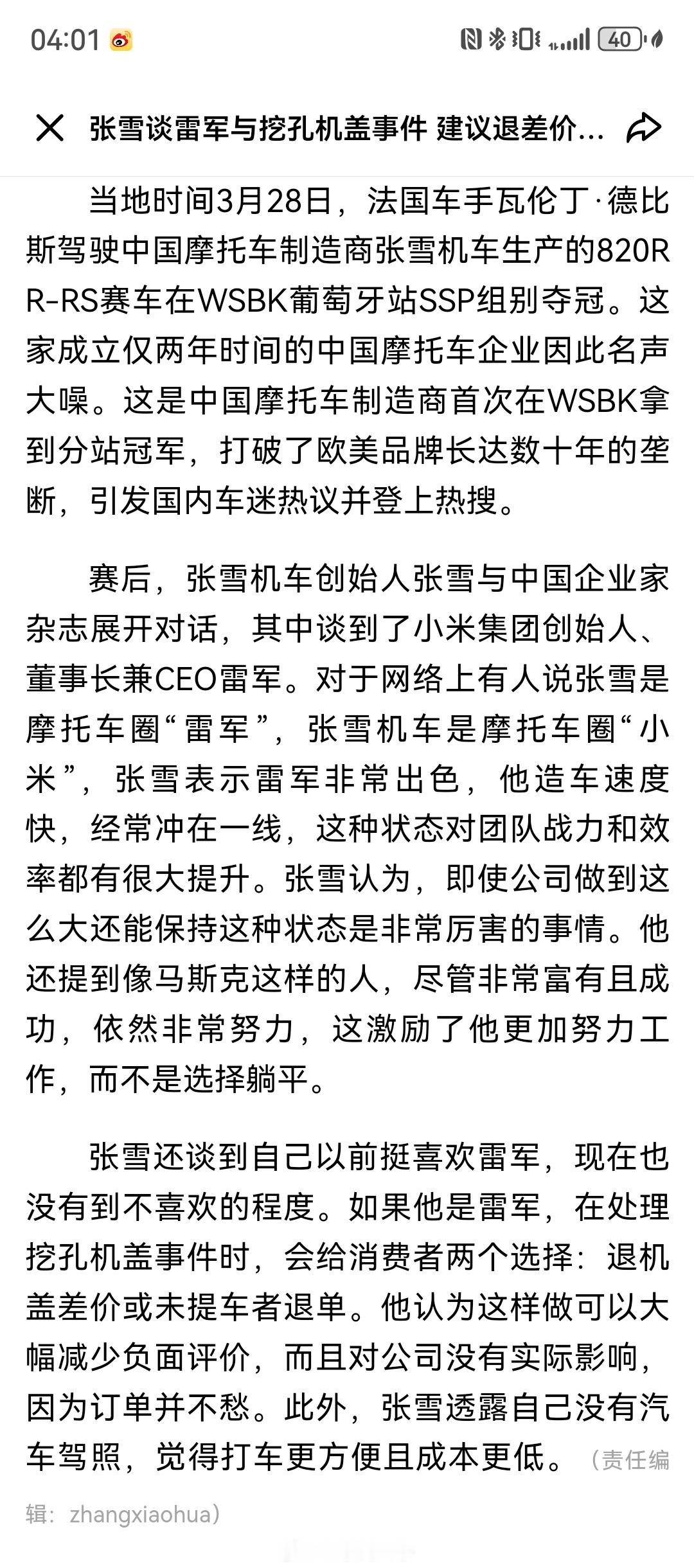 张雪曾拒绝跟华为合作张雪也是性情中人啊,他可以拒绝华为合作,也可以近日来支持余承