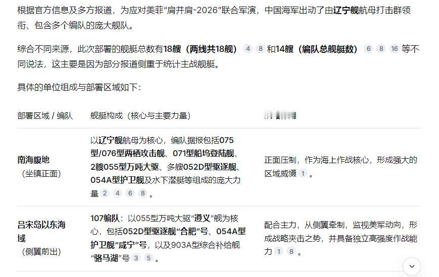 没想到,面对美菲2026肩并肩军演,中国海军竟然派了这么多船前往南海围观。据公开的消息估计,中国海军这一次派出前往南海的舰艇总共有约18艘。分别是在南海腹地,以辽宁号航空母舰为核心的舰艇编队,除了辽宁号航母本身之外,分析称还包含了一艘075型两栖攻击舰、一艘071型船坞登陆舰、两艘零5万吨大驱,以及多艘052d型驱逐舰及护卫舰。当然水下潜艇的话数量就未知了。