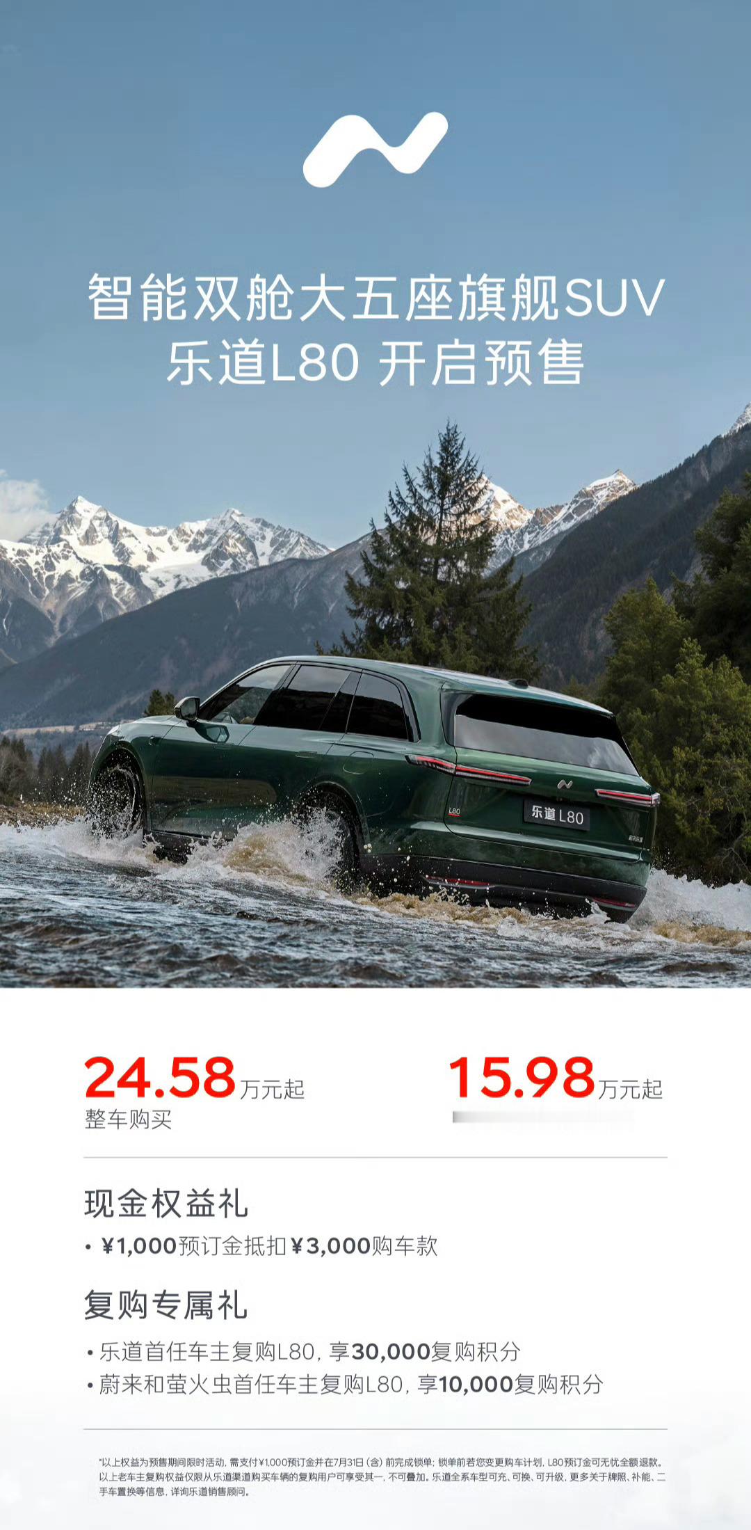 杀红眼了,乐道L80,预售价15.98万,最便宜的大型SUV。租电版,预售价
