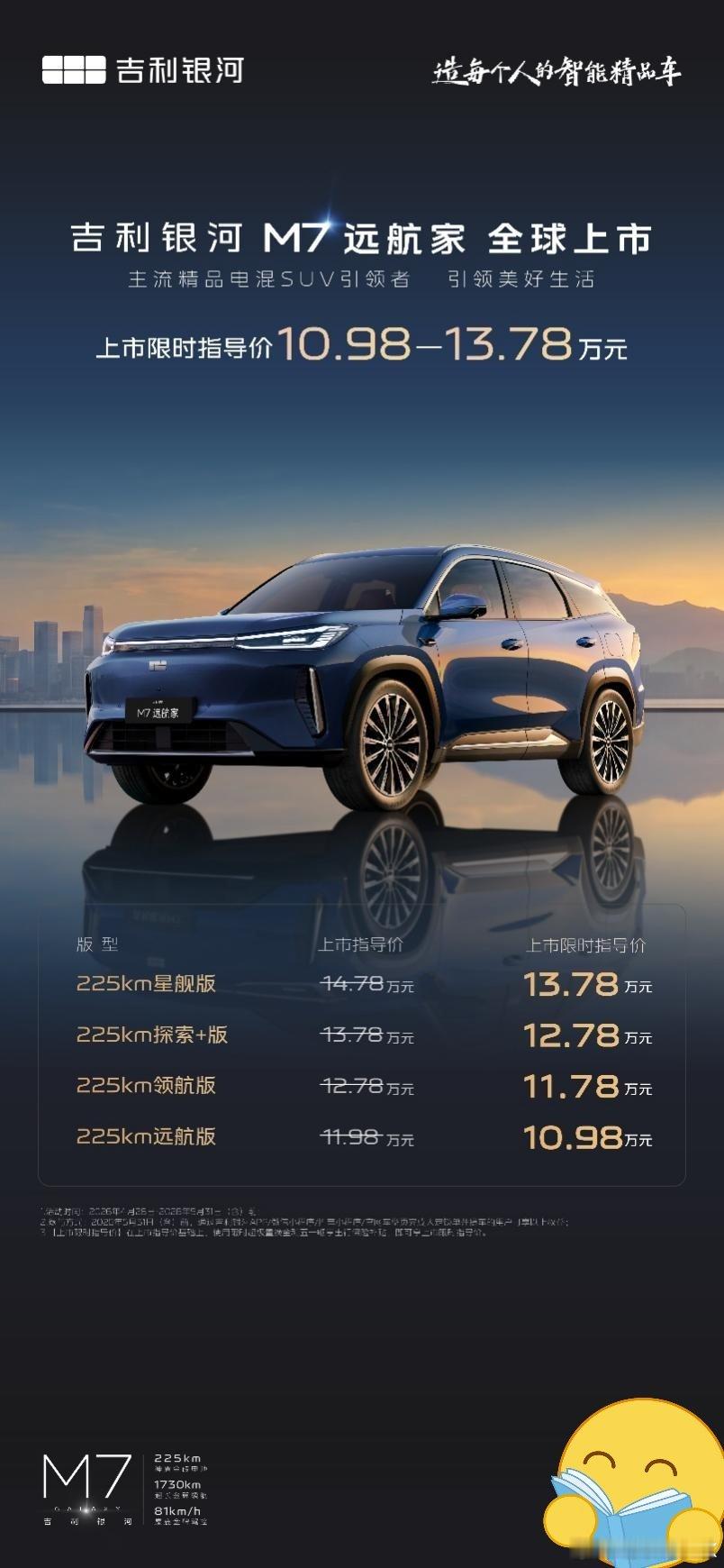 选电混SUV最怕续航焦虑和安全隐患,吉利银河M7远航家直接把主流家用车标准拉满!今天正式上市,10.98万-13.78万的定价,直接击穿性价比天花板。全系标配225km纯电续航,比同级多25km+,一周通勤充一次电够够的,日常代步电费省到偷笑!满油满电综合续航1730km,馈电油耗3.35L/100km,雷神AI电混2.0+29.8kWh神盾金砖电池,兼顾强劲动力与极致节能,快充15分钟就能从30%充到80%,4500圈循环寿命耐造又安心,百万公里安全行驶不是吹的💪家用SUV最看重的操控和安全,它直接拉满!GEA Evo架构国际团队调校,麋鹿测试81km/h媲美豪车,35.6米同级最短制动距离,紧急避险稳稳拿捏。星甲笼式车身+1500MPa硼钢门环,碰撞力层层分解,后排座椅钢板+三层安全阶梯,家人坐车彻底放心里💺空间和豪华感直接对标越级!88%得房率,后排纯平地板,全家出行都舒服。30处储物空间+700L后备箱,露营装备随便装,拓展后1990L秒变移动仓库。82%软包面积+生态麂皮,256色氛围灯+23扬声器全景声,车内就是私人音乐厅,静谧感直接拉满🎵智能配置更是卷到没朋友!Flyme Auto 2系统配7nm芯片,桌面大卡、全场景语音秒响应,50W无线充电+25.6英寸HUD,用车便捷度拉满。千里浩瀚辅助驾驶H3方案,高速自动超车、全场景精准泊车,AEB/AES主动安全守护,新手也能从容驾驶🚗10.98万起就能拿下主流精品电混SUV顶配比肩款,5月31日前下定还有八重权益,置换补贴、保险补贴、流量质保全安排!想给家人换台安心又划算的车,这波真的可以冲🚀吉利银河M7远航家10.98万起吉利银河M7远航家上市