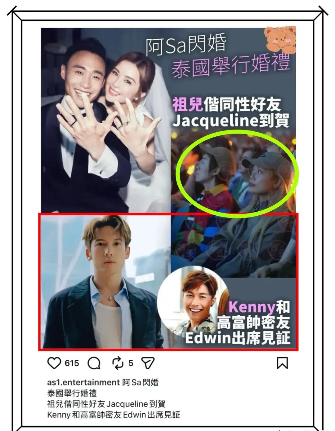 港媒曝阿sa泰国办婚礼,容祖儿、关智斌各自带着同性密友到场祝贺!