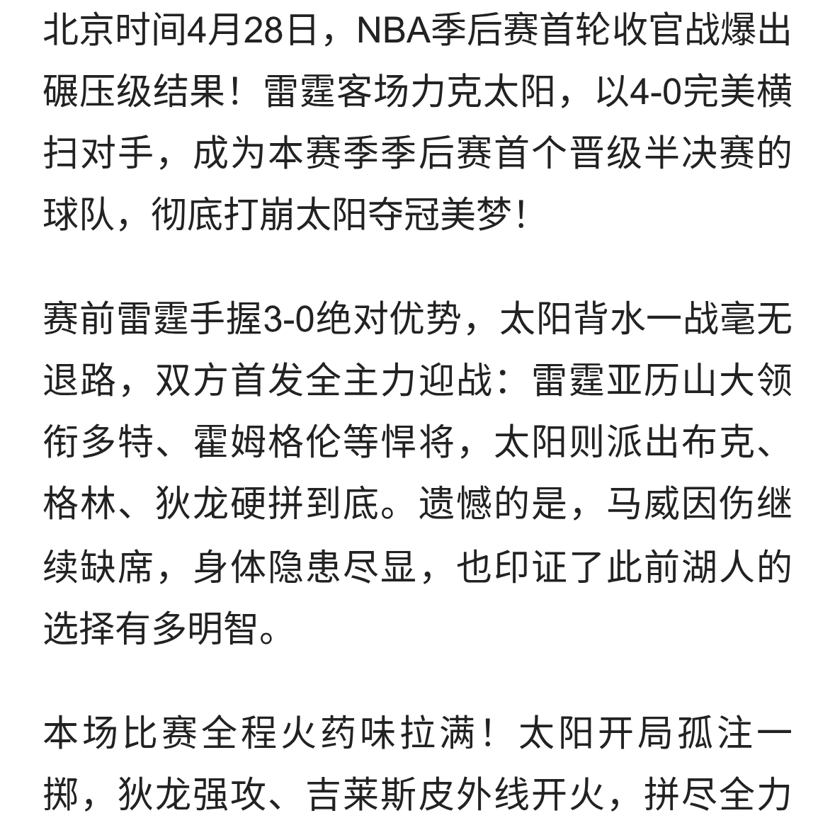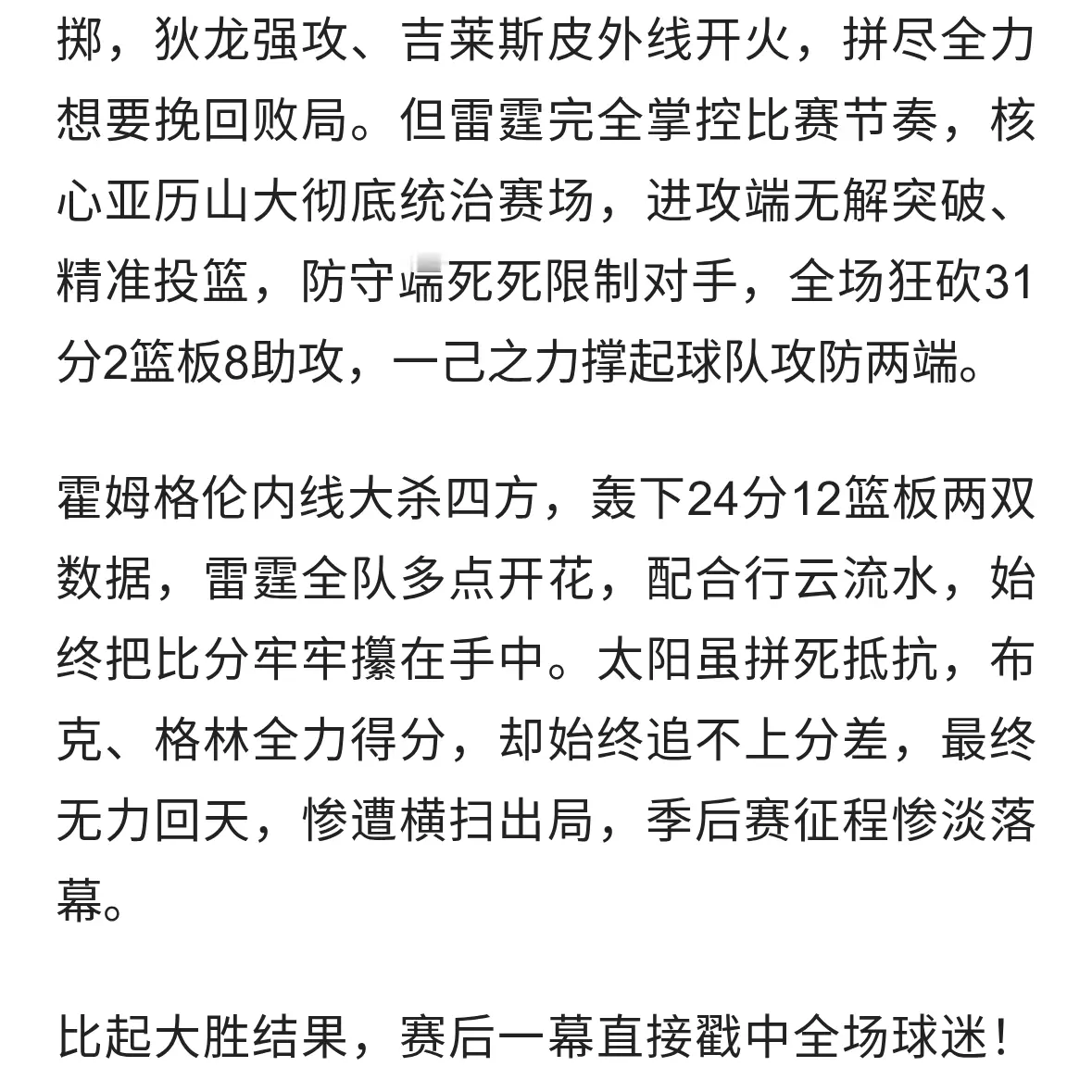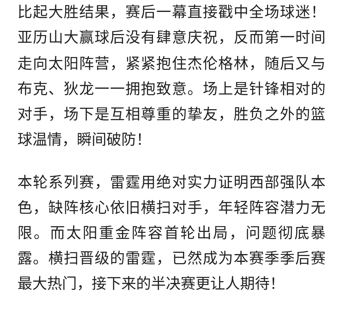 雷霆4-0横扫太阳!亚历山大轰31+8封神,赛后拥抱格林看哭球迷