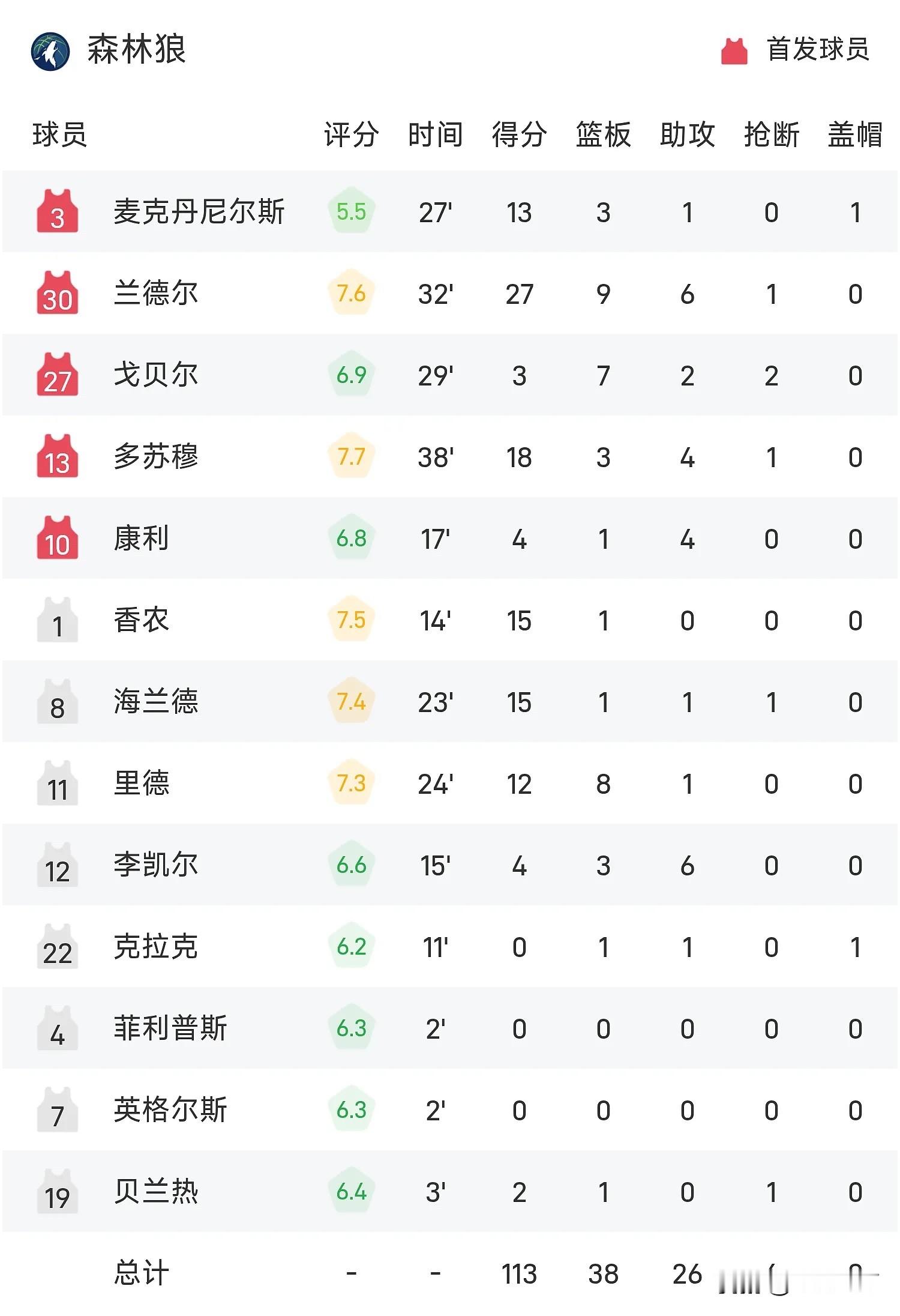 具体到个人,约基奇打出了27分11个篮板16次助攻的超级三双,攻防两端把球队扛在肩上,内线强吃完了还能眼观六路串联外线。穆雷全场24分7次助攻,联手约基奇把体系运转到了极致。替补上来的琼斯成了奇兵,三分球连中3记独砍18分,为掘金拉开比分立了大功。森林狼这边兰德尔拼下27分9个篮板6次助攻,多苏穆18分,里德12分8个篮板,全队也就他们仨在苦苦支撑,其他人没能提供足够的火力。