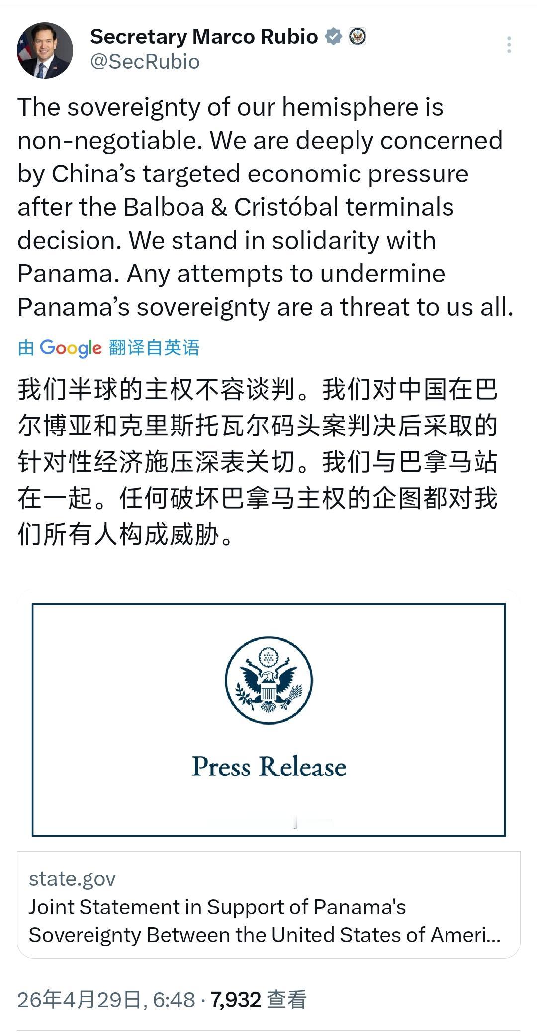 美国国务卿鲁比奥今天(北京时间4月29日)发文写道:“我们半球的主权不容谈判。我们对中国在巴尔博亚和克里斯托瓦尔码头案判决后采取的针对性经济施压深表关切。我们与巴拿马站在一起。任何破坏巴拿马主权的企图都对我们所有人构成威胁。”