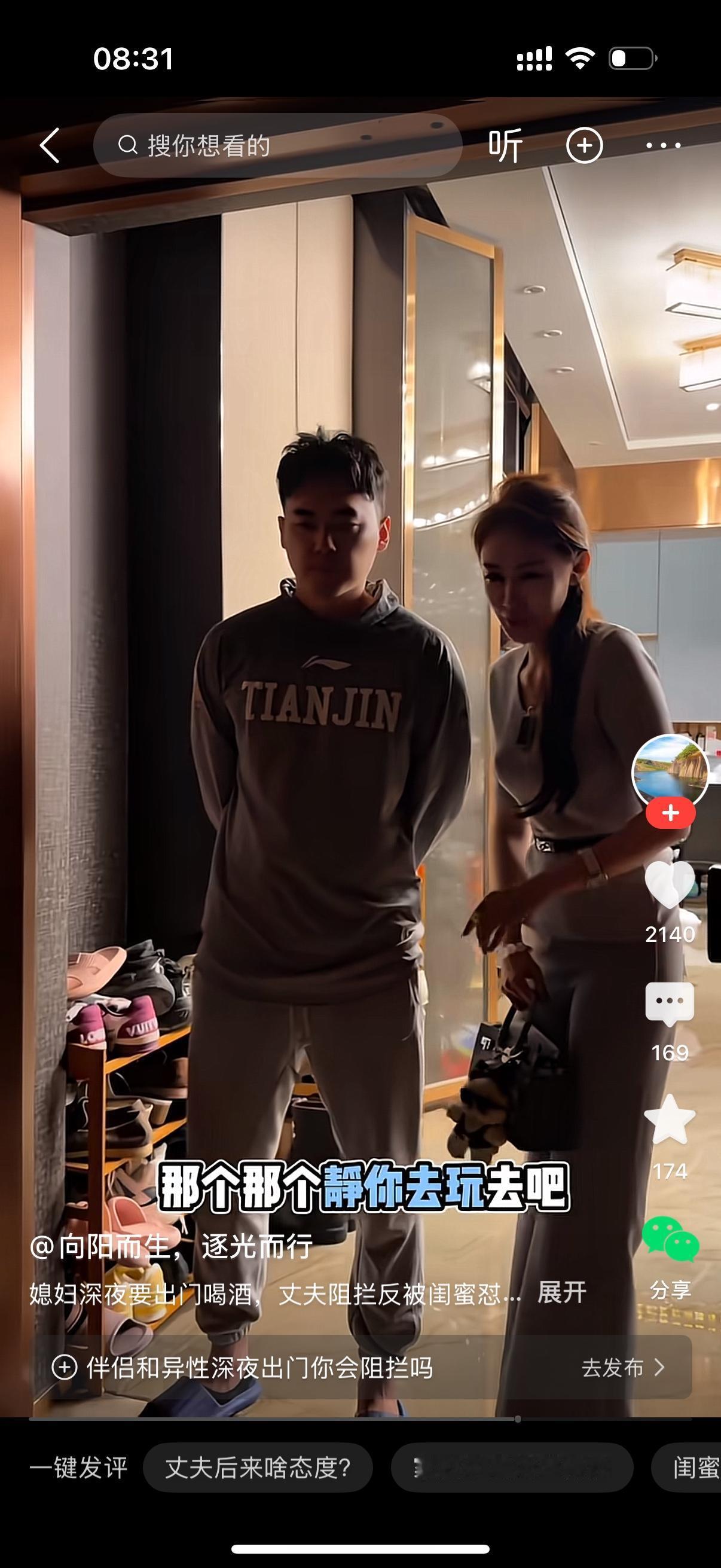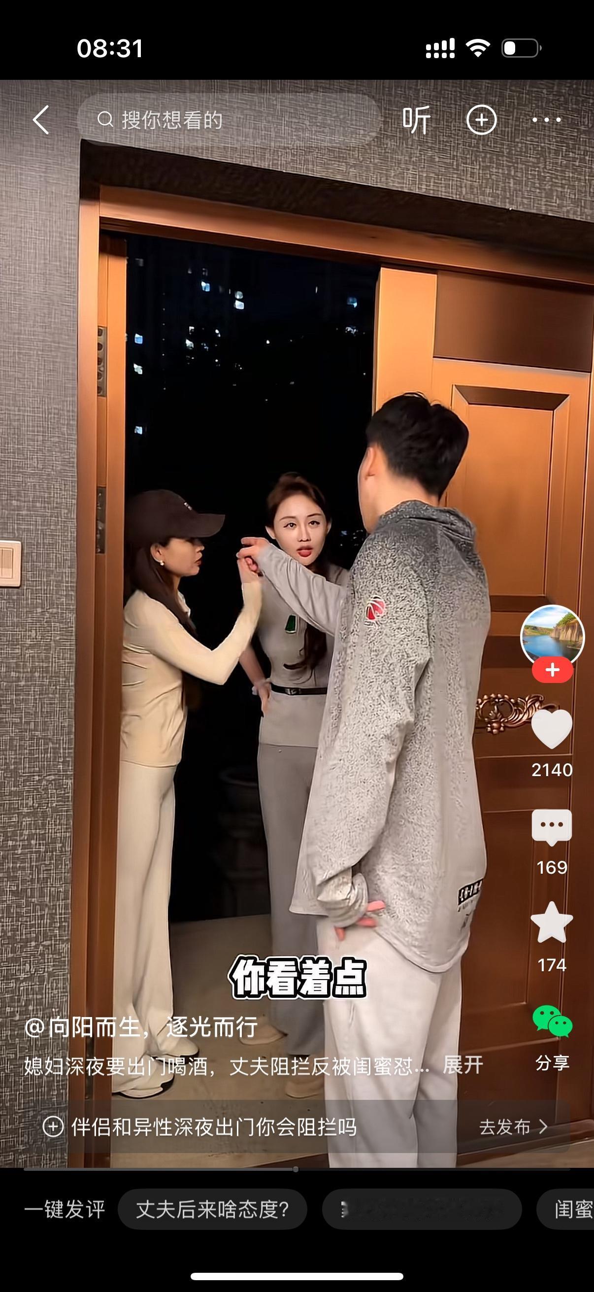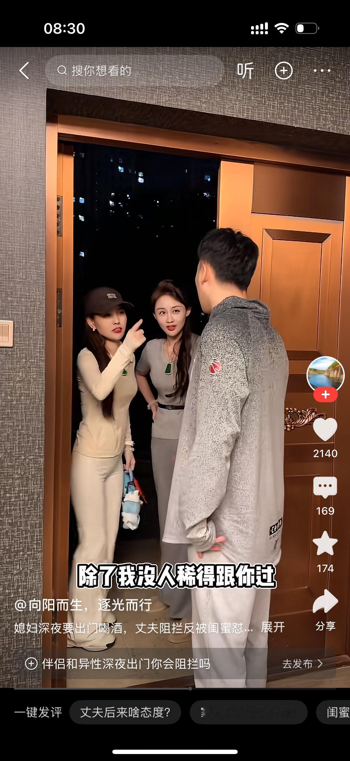 女人半夜三更和闺蜜出去玩。男人叫住她,你别去。闺蜜说,你又不喝酒,管那么多干啥?