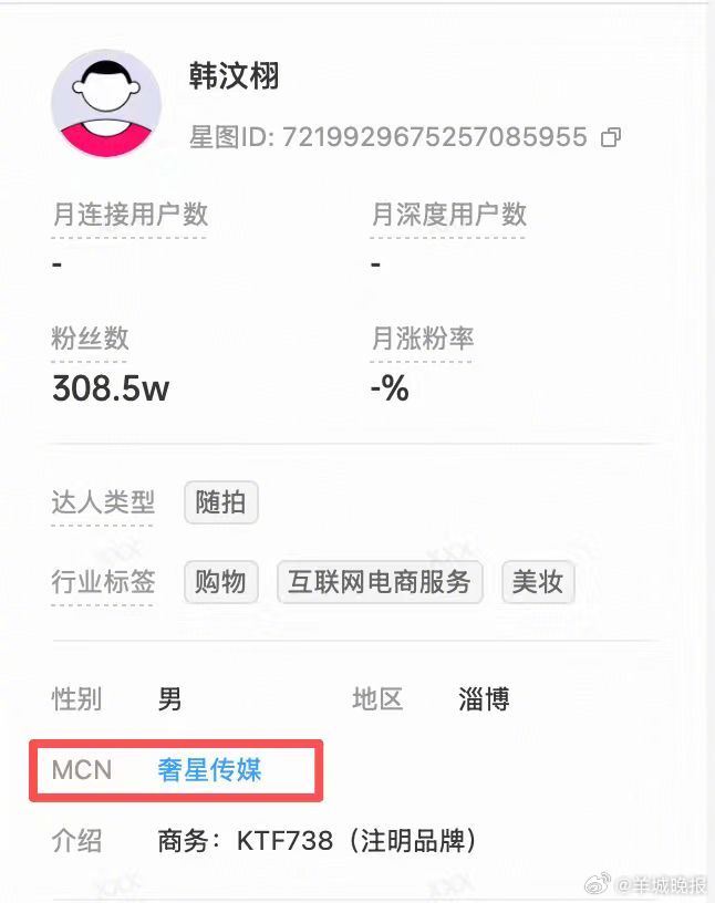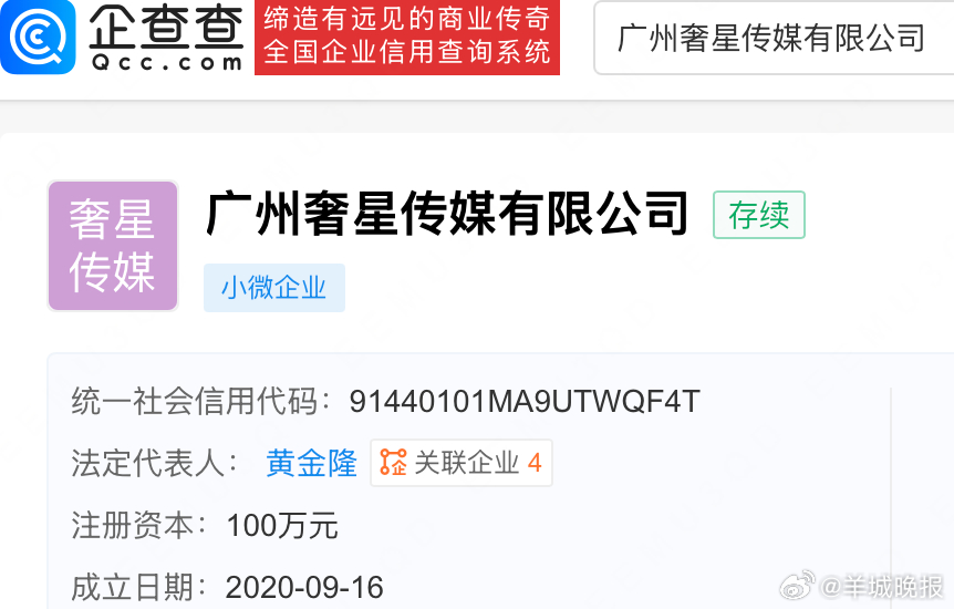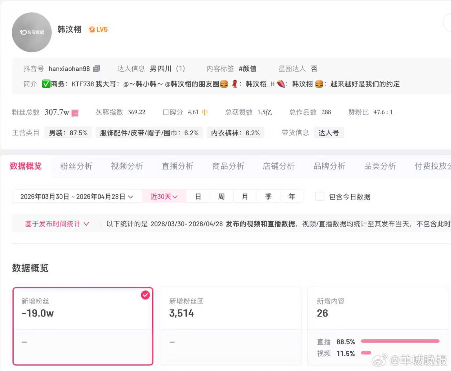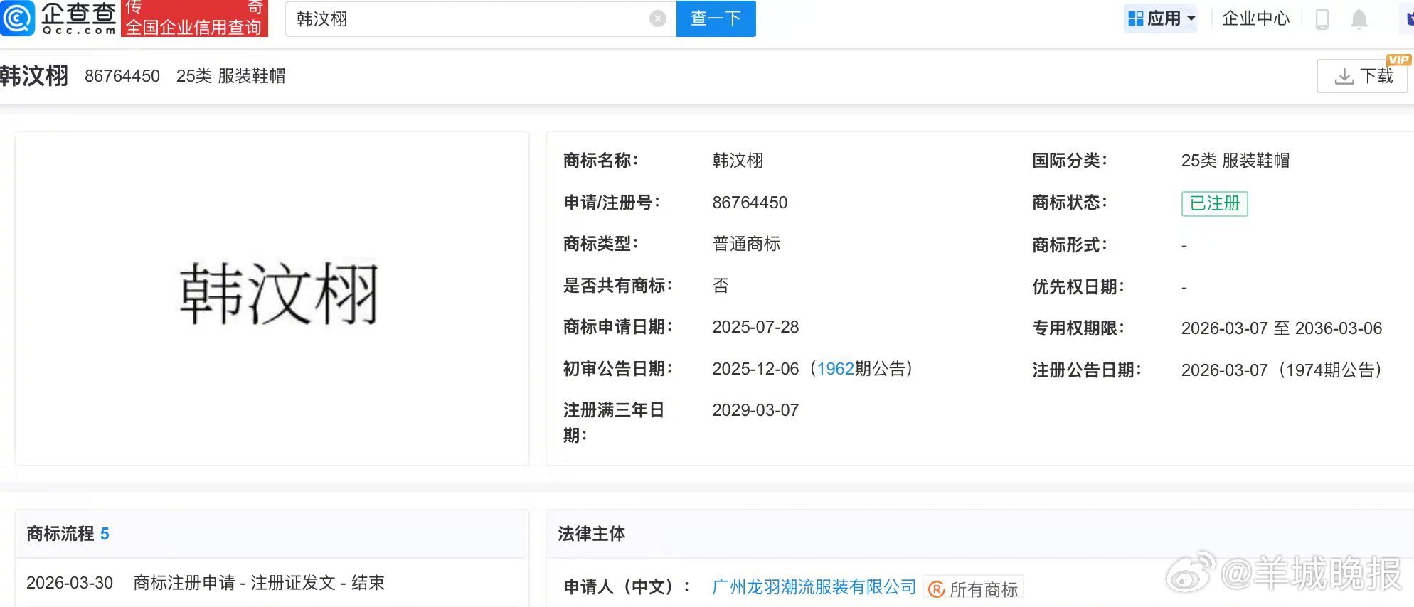 #韩汶栩近30天掉粉19万#【#韩汶栩公司已注册其姓名商标#】近日,网红主播韩汶栩官宣恋情后,因多名女性接连曝光与其存在情感纠葛,被网友戏称为“韩家大院”,引发讨论。经查询,第三方平台信息显示,韩汶栩关联MCN为奢星传媒,其账号近30天已掉粉19万。据企查查APP显示,广州奢星传媒有限公司成立于2020年9月,法定代表人为黄金隆。信息显示,黄金隆另关联广州龙羽潮流服装有限公司,该公司成立于2025年3月,韩汶栩对其持股50%。目前,该公司已注册韩汶栩姓名商标,国际分类为服装鞋帽。更多消息:#白鹿奔跑吧本次最后一次上班##白冰从发廊小哥到偷税网红##曝韩汶栩睡粉##宋威龙田曦薇 潮热雨季未解之谜##迪丽热巴金刚发型##一个探店博主为何能偷税近千万#(编辑:杨雨桐;审签:周乐瑞)