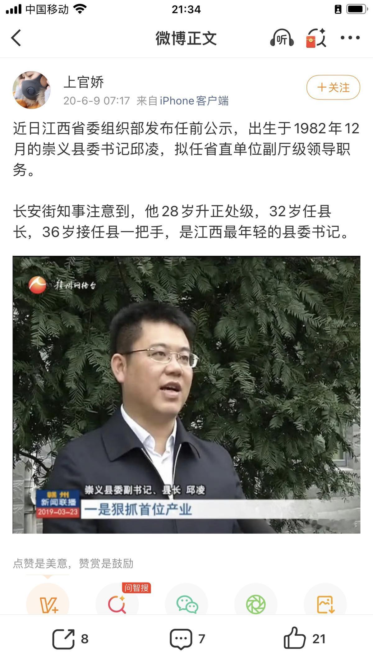 2019年,邱凌再次迎来仕途升级,37岁的他正式担任崇义县委书记。