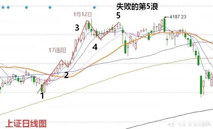这一点大家可以看一下去年17连阳之后的走势。17连阳之后的走势,也就是这种反弹无力的情况。反弹无力的情况下,最终迎来了两天的深度快速调整。大家请看下图二去年上证指数17连阳之后,市场走出了失败的第5浪。去年17连阳之后市场走出了失败的第5浪最后总结一下,今天上午的走势说明什么问题?今天上午的走势,说明短线主力在这个位置有明显的兜底动作。市场接下来有望展开第5浪的拉升。但是这个第5浪的拉升,我们还需要走一步看一步。重点观察反弹的持续性和量能的配合程度。