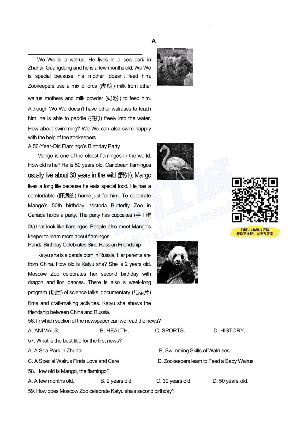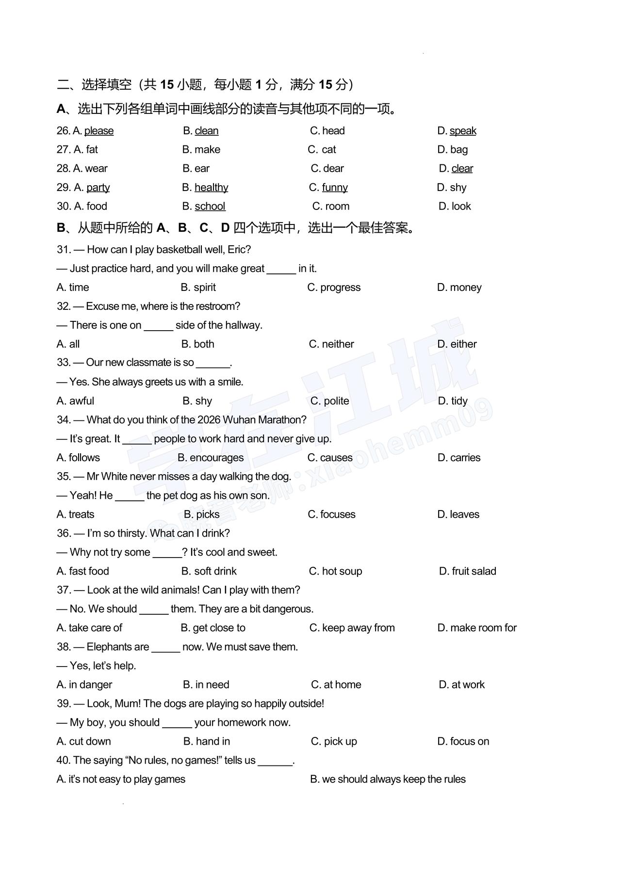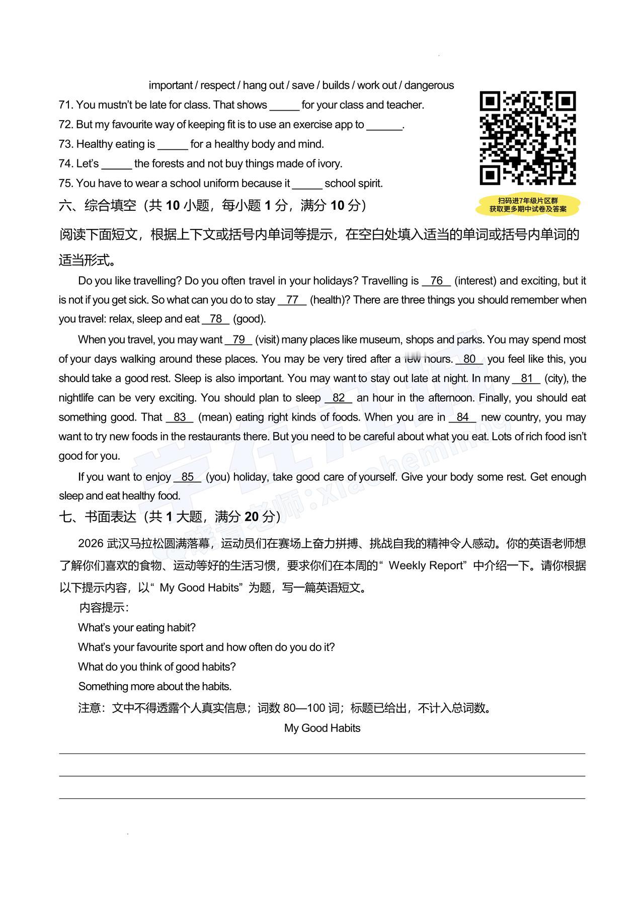 【七年级青山区英语】2025-2026下学期期中试卷及答案