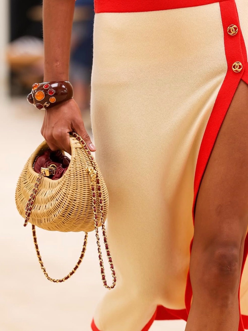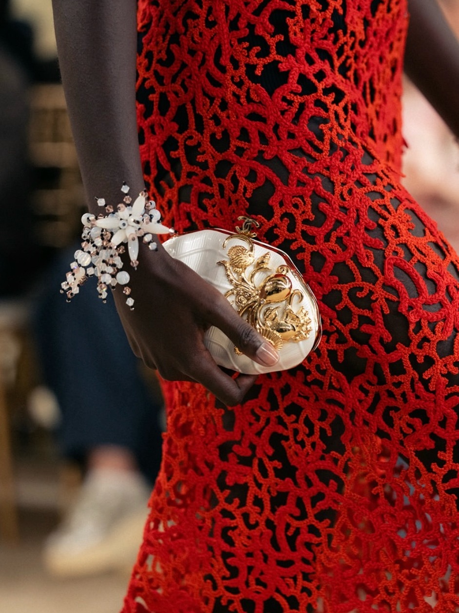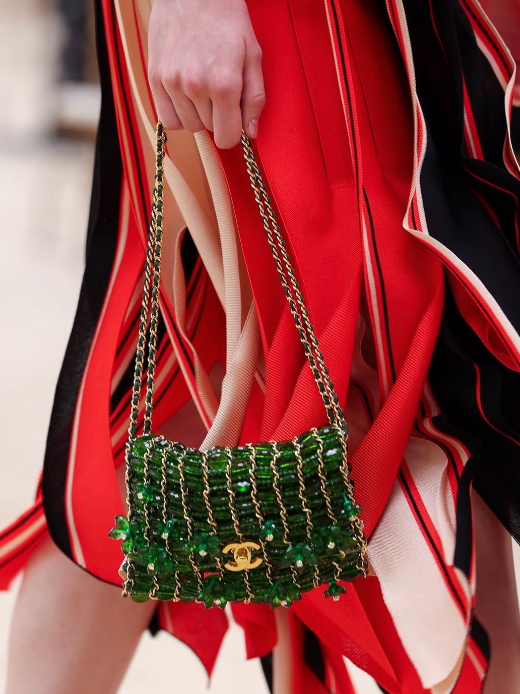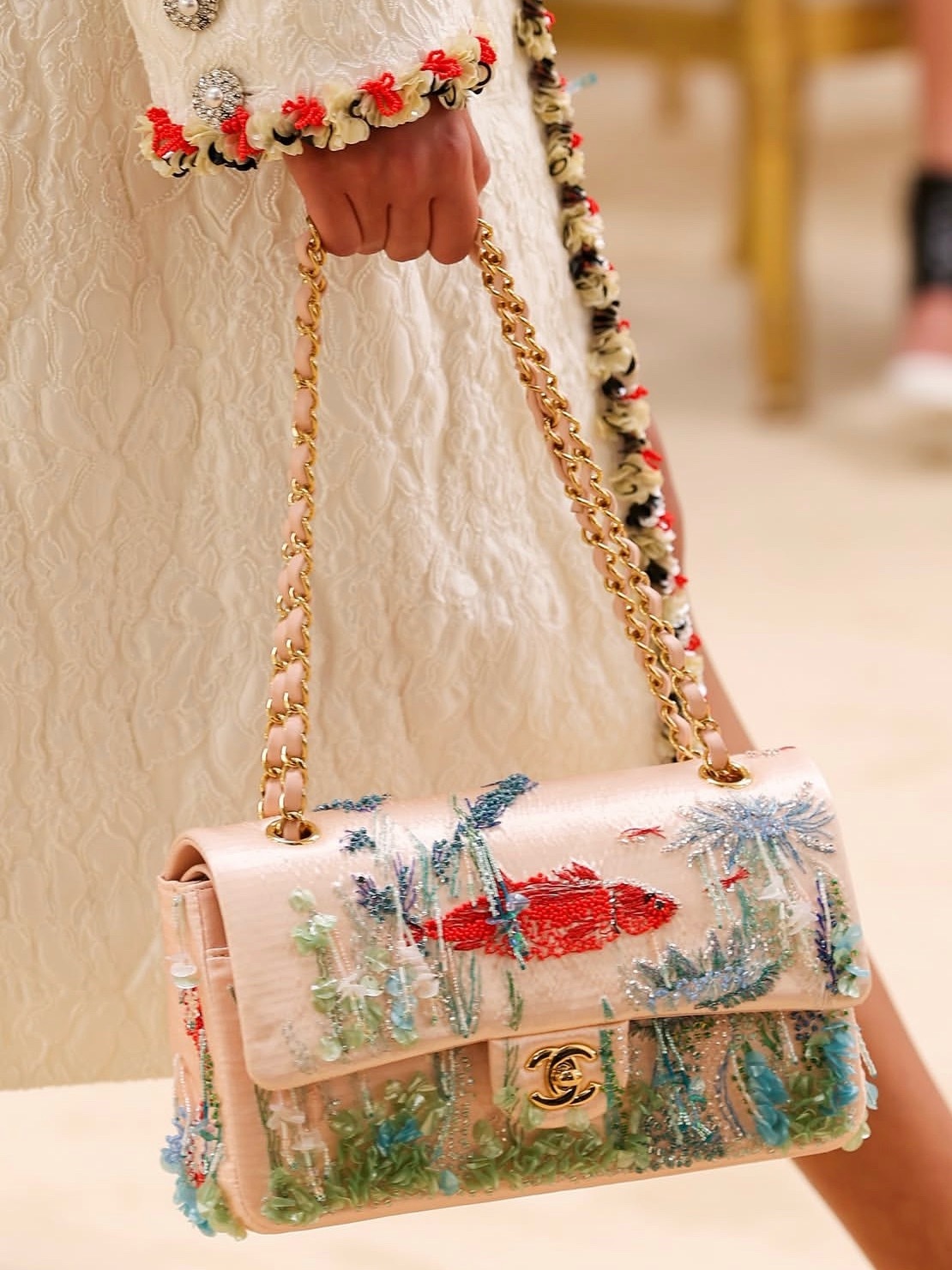 这一季更像是一场被海风轻轻掀开的梦。Matthieu Blazy 并没有简单复刻度假语境里的“轻盈”,而是将海的湿度、盐分与热烈一并织入廓形与图案之中。辣椒的红,不再只是装饰性的点缀,它像温度本身,为 Chanel 一贯的优雅注入一点不设防的炽热;而那些游弋的海洋生物,则让整体叙事多了一层流动感——仿佛衣料也在呼吸。