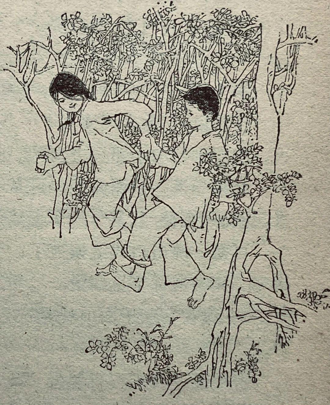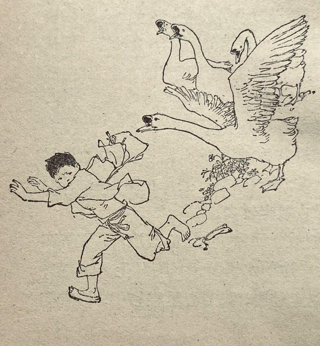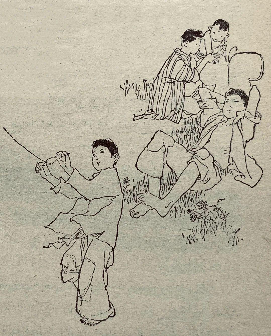 80年代儿童题材插图中的精品,韩硕的线描干净利落,既保留了传统白描的韵味,又以松弛的形态造型传递出角色的温度,人物动态生动,情感细腻,寥寥几笔便勾勒出童年的纯真与江南的烟火气。