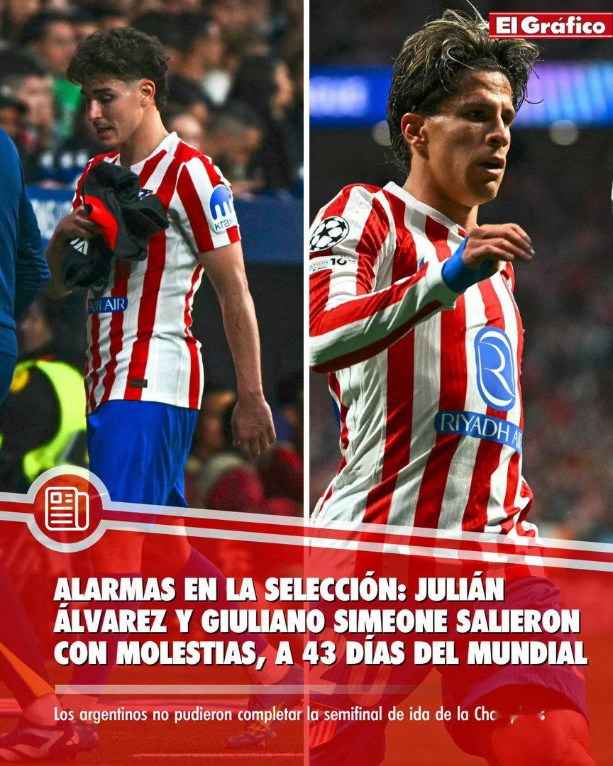 🚨世界杯开赛前43天,阿根廷国家队再添伤员🇦🇷此前媒体报道:🤕阿尔瓦雷斯和朱利亚诺·西蒙尼因身体不适离场,未能完成马德里竞技vs阿森纳的欧冠半决赛。✍️马竞方面预计将在未来几个小时内公布医疗报告。