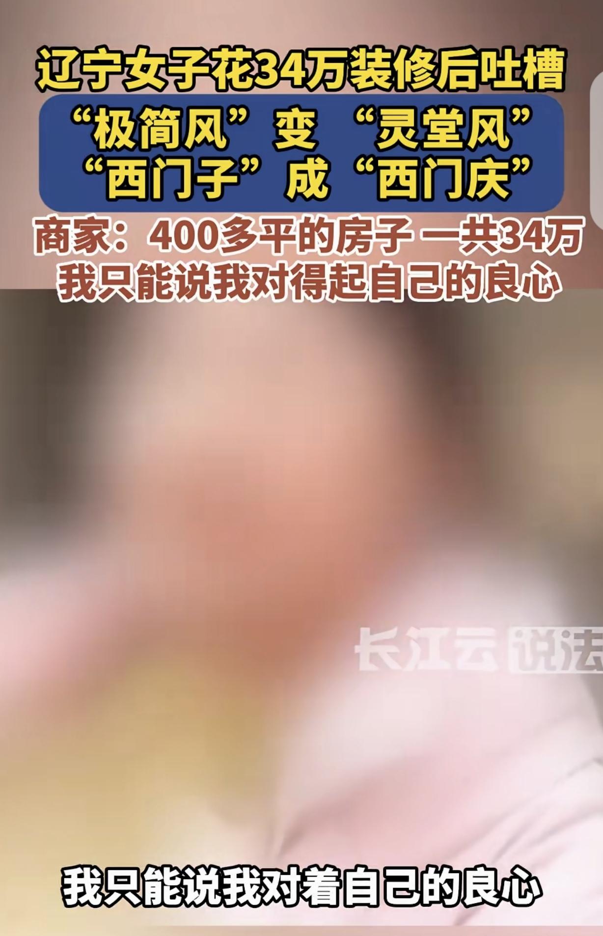 4月23日报道,辽宁沈阳“史诗级”装修翻车:34万装出“灵堂风”!“西门子”变“西门庆”,“小末”冒充“小米”。面对质问,老板竟称:34万装400平,我对得起良心!