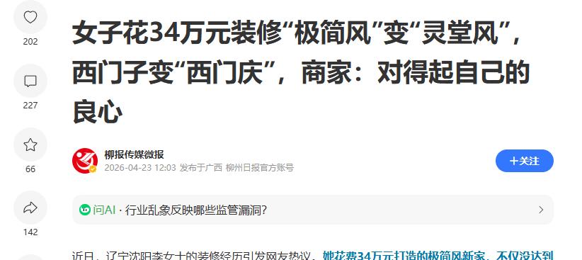 柳报传媒微报2026-04-23《女子花34万元装修“极简风”变“灵堂风”,西门子变“西门庆”,商家:对得起自己的良心》