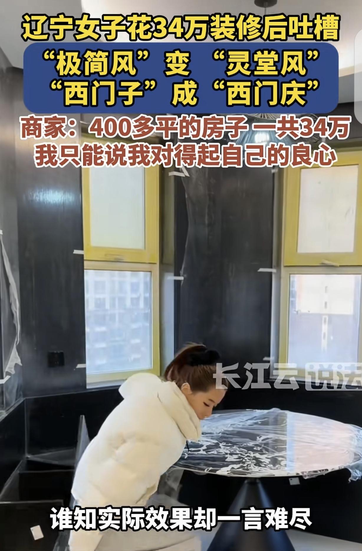 据了解,事情的主角是李女士,她在沈阳买了套400平的房子,为了装出自己想要的样子,几乎把大半辈子的积蓄都投进去了,单装修就花了34万,合同上白纸黑字写的是极简风。