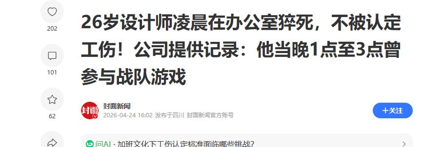 封面新闻2026-04-24《26岁设计师凌晨在办公室猝死,不被认定工伤!公司提供记录:他当晚1点至3点曾参与战队游戏》