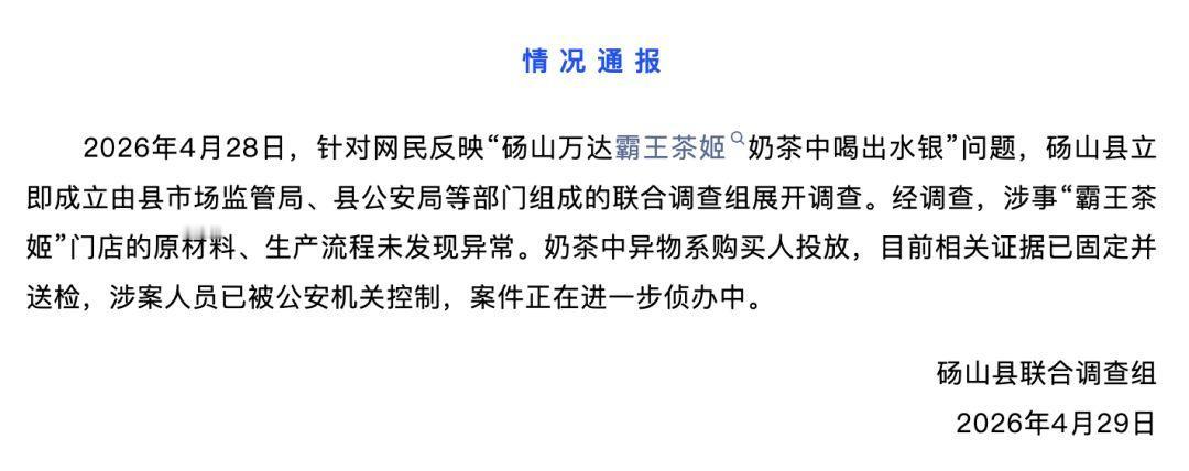 信息来源:新民晚报 2026-04-29《女子在霸王茶姬喝出水银?官方通报:奶茶中异物系购买人投放》