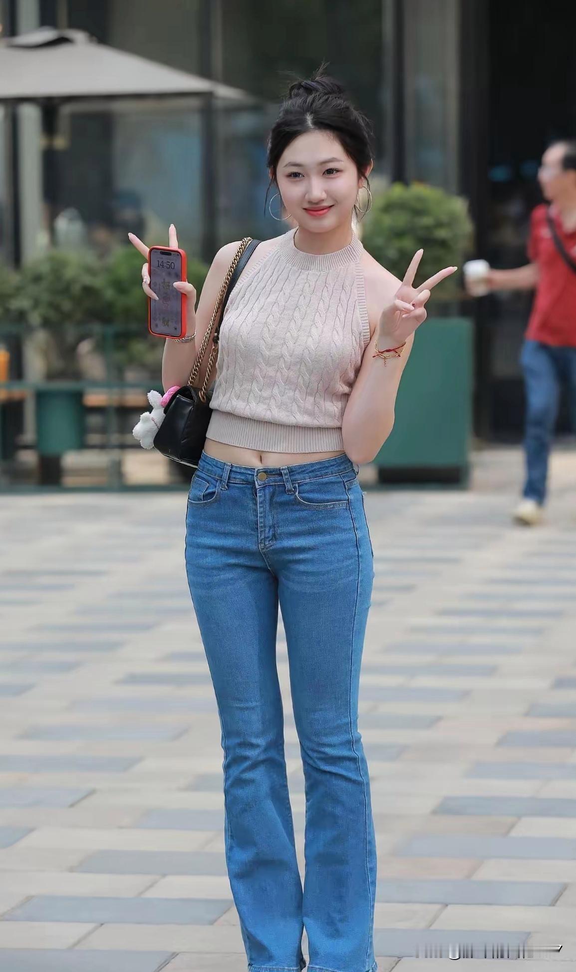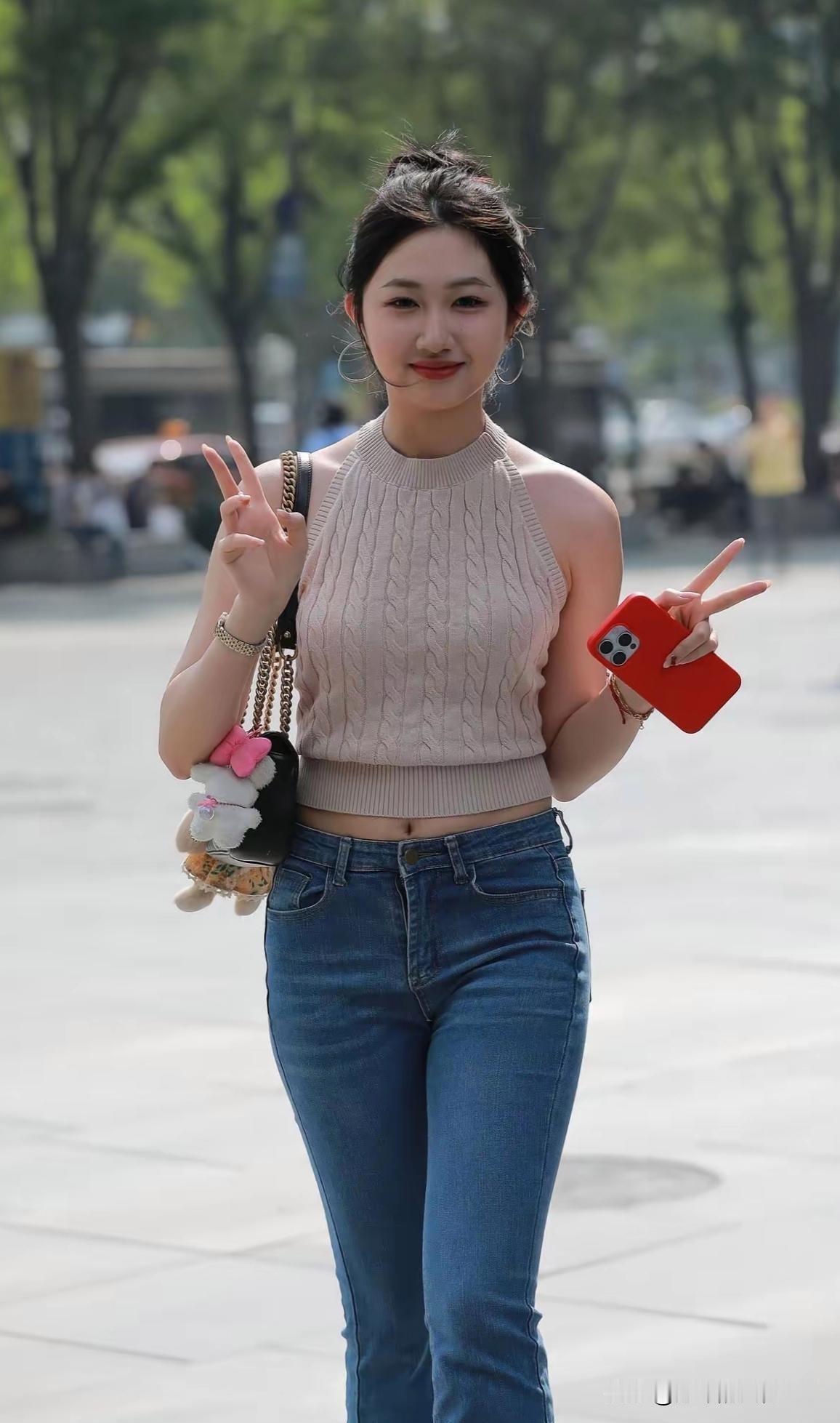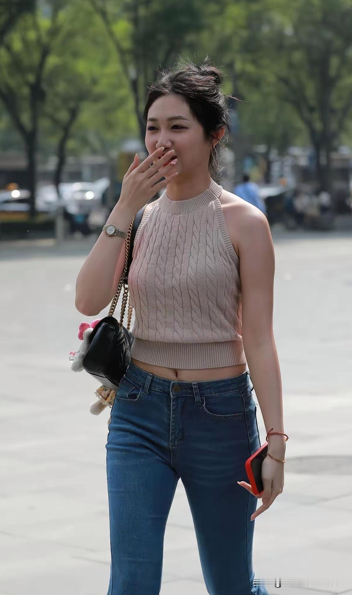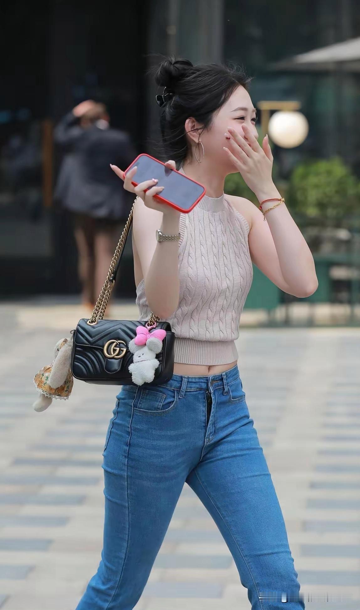 都市时尚女孩,黑色背心搭配牛仔裤,手拿粉色包包,享受夏日饮品。穿搭街拍