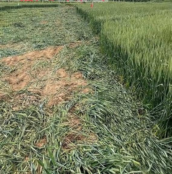 网友发布的视频显示,一大片麦田中,中间区域部分麦子已被推倒。倒地的麦子,顶部已经结出麦穗,麦田里还有明显的车辙印。
