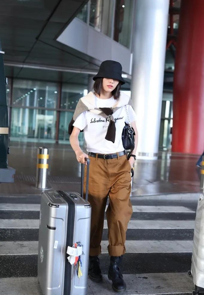 刘雯的私服,才是真正的“行走的穿搭教科书”! 白T+卡其工装裤+腰间披肩,再