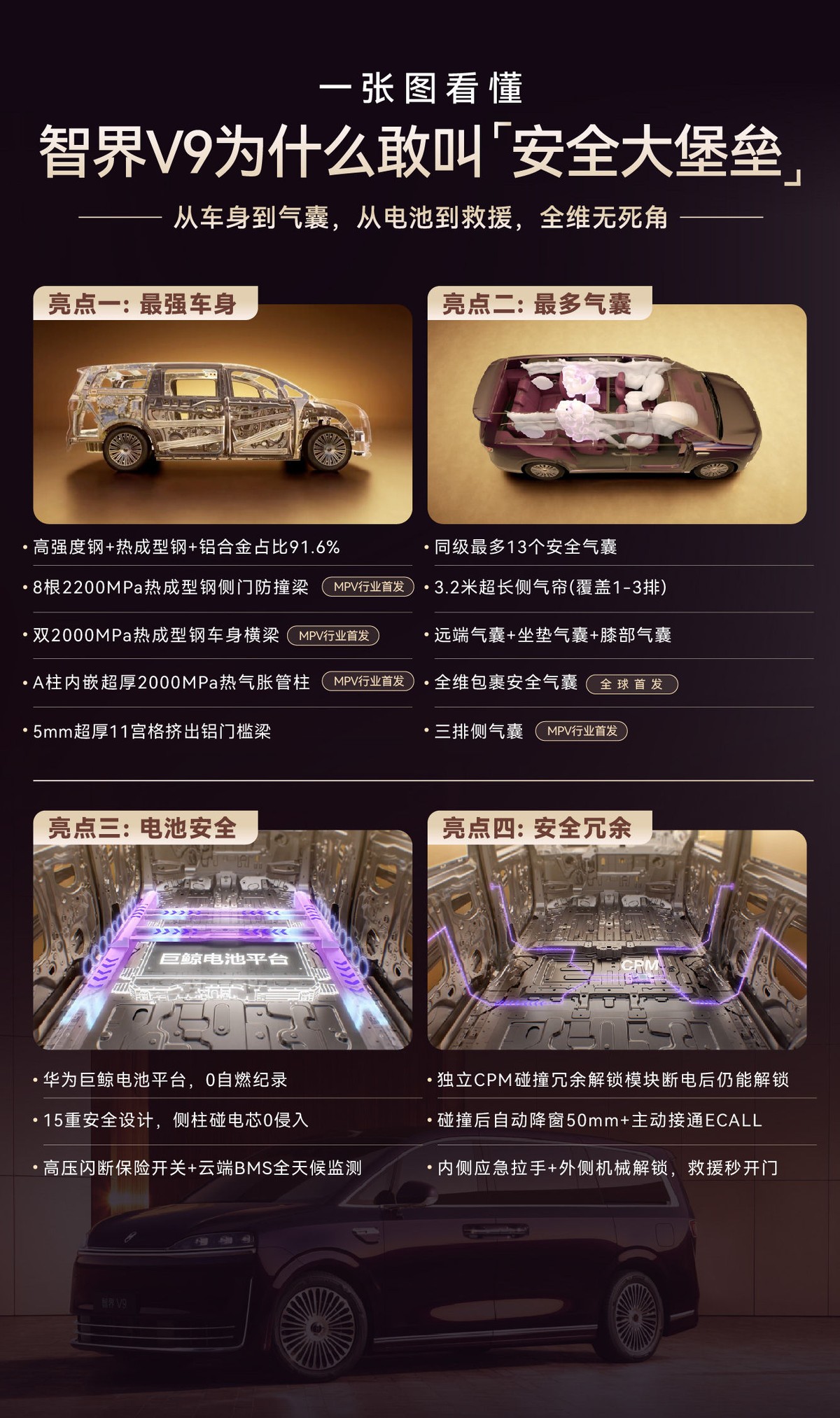当全家满载开启周末自驾,当老人抱着孙辈坐进第三排,当商务伙伴在二排躺乘小憩——你是否意识到,90%的同级MPV都在偷偷“偏心”:前排堆料拉满,第三排却成了“安全盲区”,二排躺乘遇碰撞防护直接失效,追尾事故车尾形变分分钟挤压乘员舱。这种“重前轻后”的行业通病,让MPV用户的核心刚需被彻底忽视:让全家人都坐进安全区,从来不是一句空话**。直到智界V9带着全球首创的安全技术矩阵破局,直接戳穿了MPV行业的“安全伪命题”。
