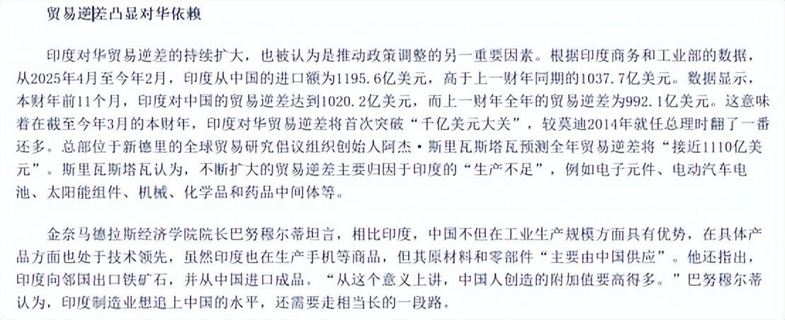 简单来说,印度购买我国的产品,要比我国购买印度产品多出来1000多亿,这说明了印度对我们的高度依赖。