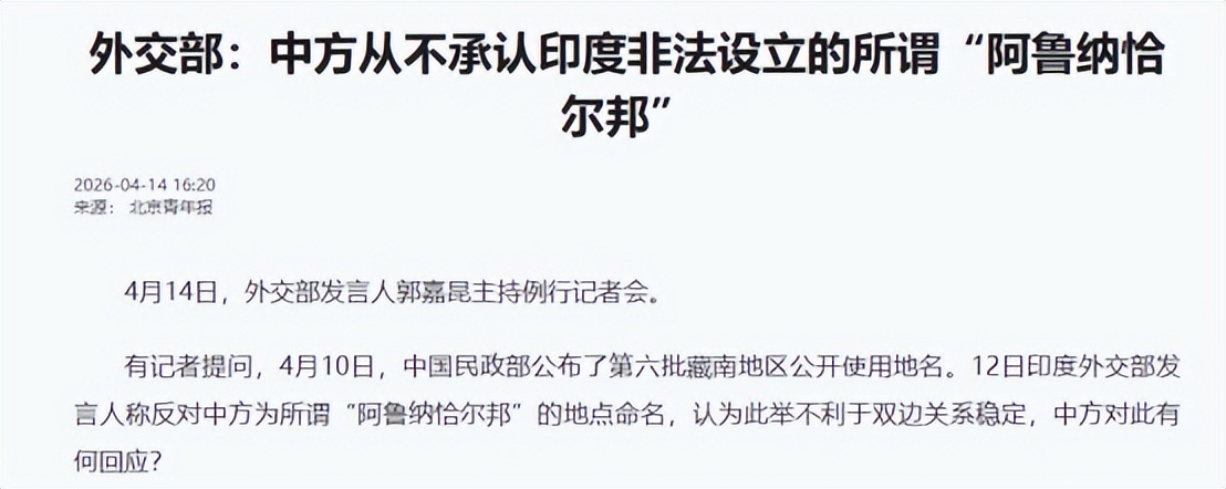 外交部:藏南地区是中国领土,中方从不承认所谓“阿鲁纳恰尔邦”——2026-04-14 15:32——澎湃新闻