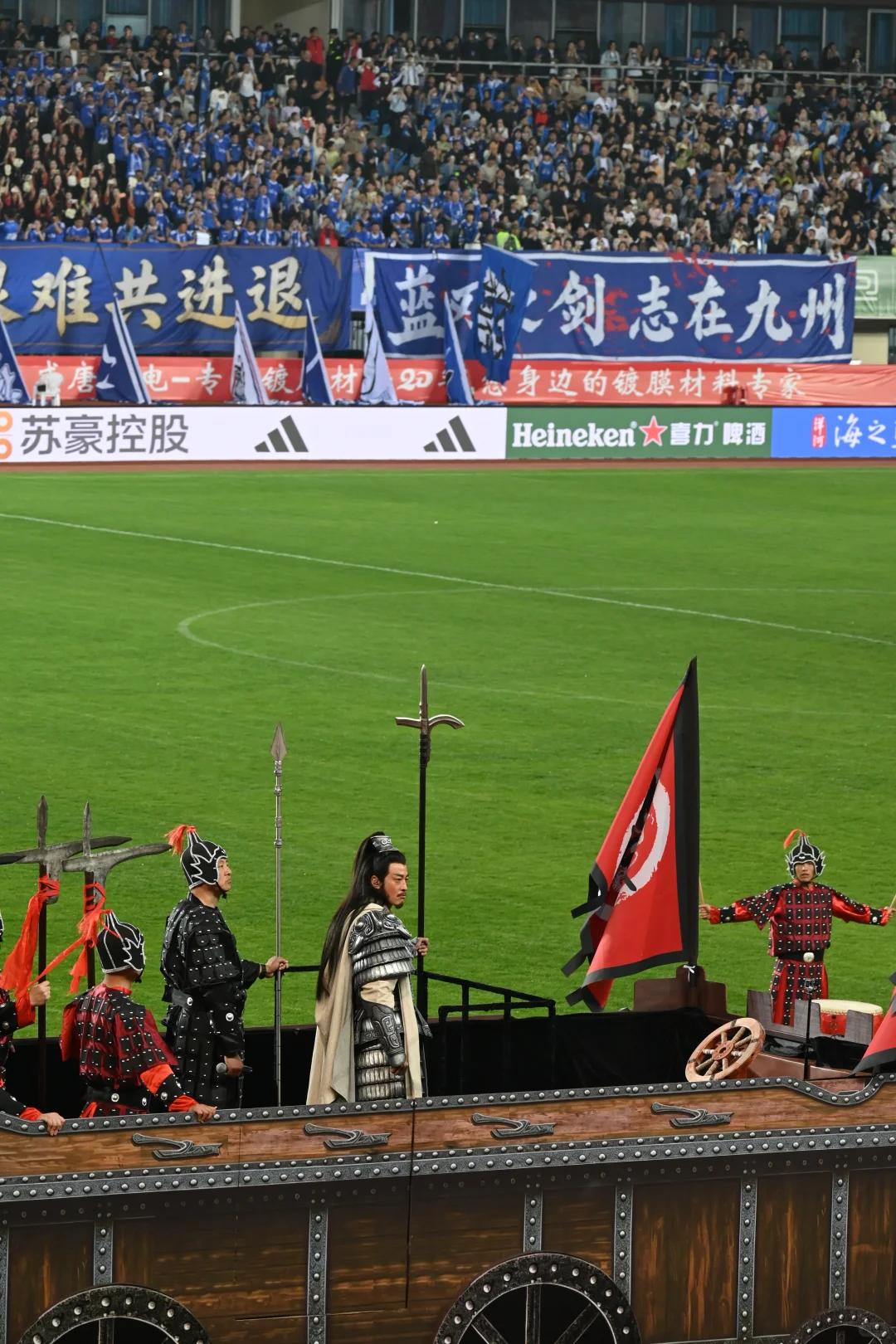 这时候项羽的老家——江苏宿迁反应特别快,他们抓住这个热点,直接邀请何润东穿上“西楚霸王”的经典行头,回到老家给“苏超”联赛助阵。