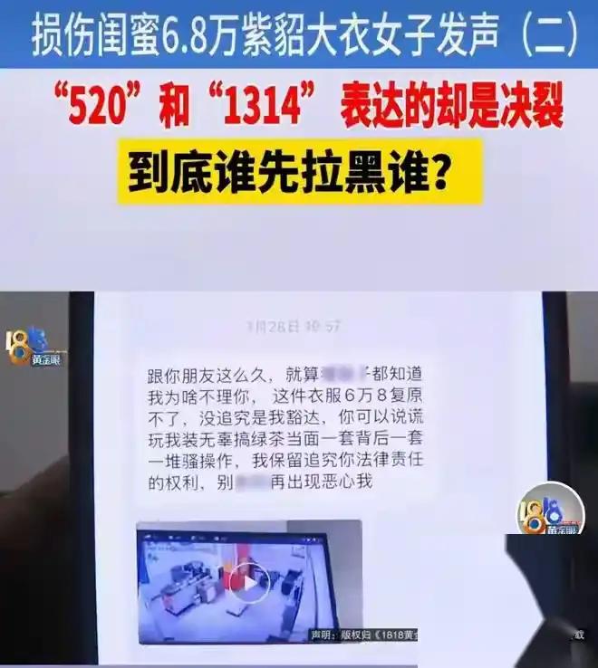 先是擅自试穿,拖地、乱扔、碰上粘鼠板,撕扯出一地貂毛,搞得像在完成什么“破坏任务”。紧接着,事发后不是赶紧道歉、想办法补救,而是下意识把责任推得一干二净。张女士调监控,证据摆在面前,她还只转了520块,说是“干洗费”。有点讽刺,张女士反手转回1314,意思很直接:真要用钱了事,我翻倍还你,情分就此两清。