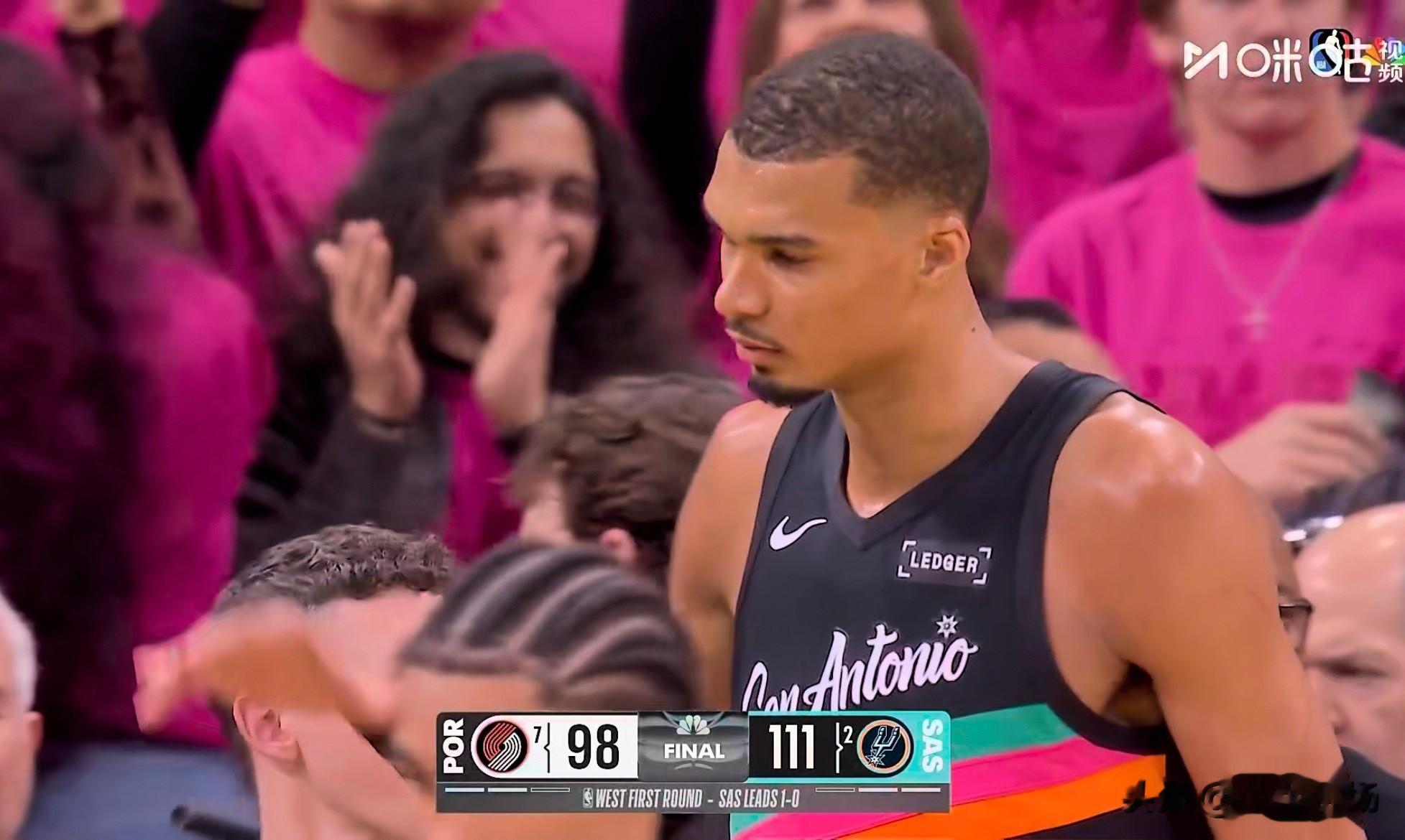 说几个比赛的关键节点,第二节末段,我们一度把分差追到7分,但文班亚马连得5分,半场结束又拉开到10分,第三节我们打出10-2的高潮追到2分,眼看着要反超,结果马刺马上回应一波三分雨,这就是季后赛经验的问题,我们在关键时刻缺少能一锤定音的人,而马刺有文班亚马和福克斯。