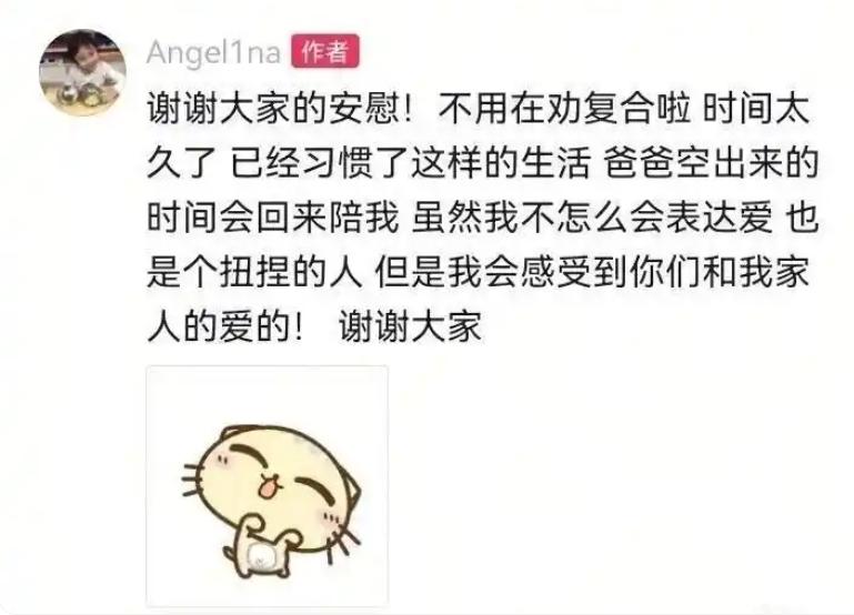父母即使不在一起,但对她的爱并不会少,祝福他们。