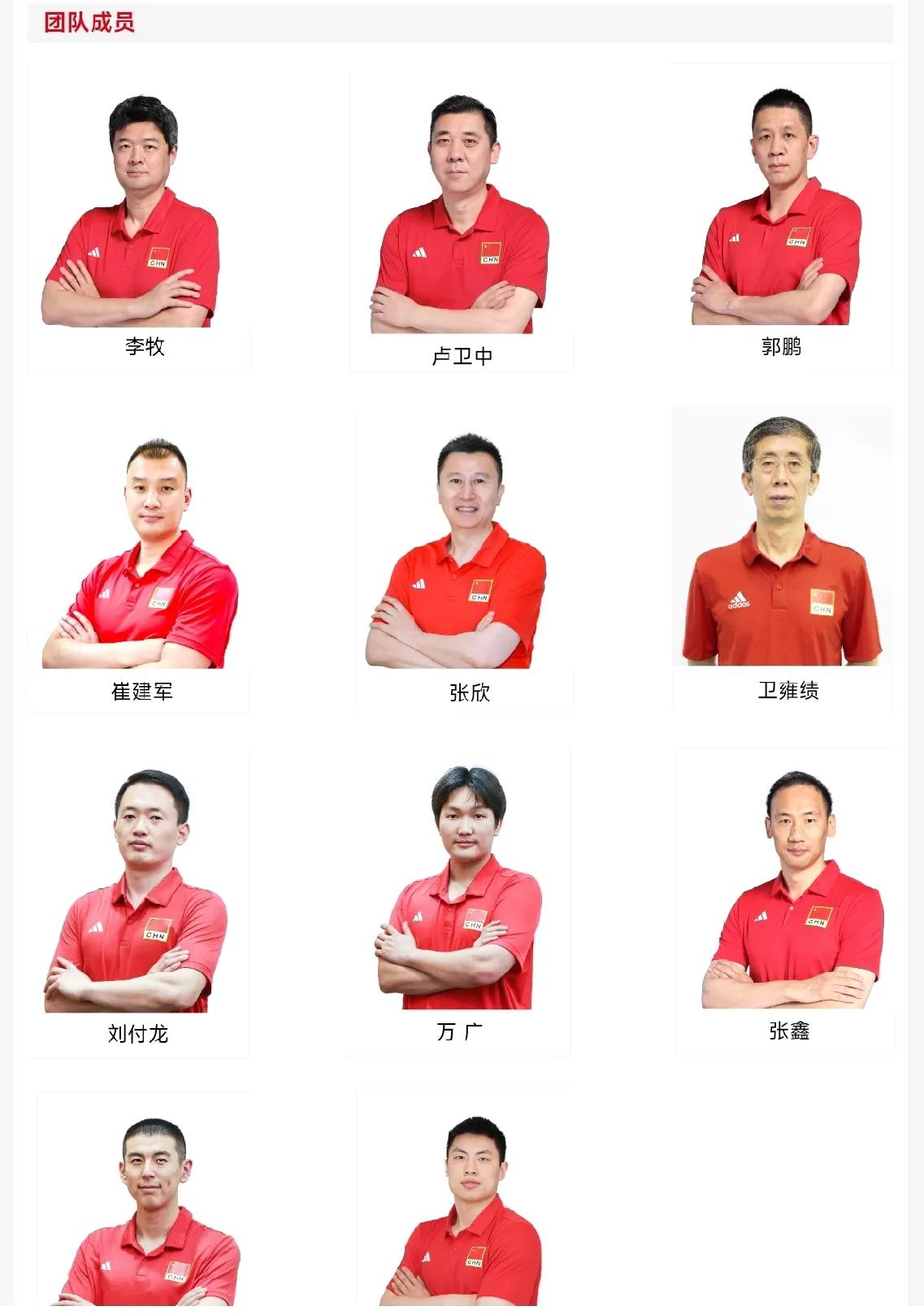这是中国男排的教练团队,包括助理教练,体能教练,队医,领队等11人。队医总负责人卫雍绩也是中国女排的队医。新一届中国男排一共是30人的团队。2/3是队员,1/3是教练团队。