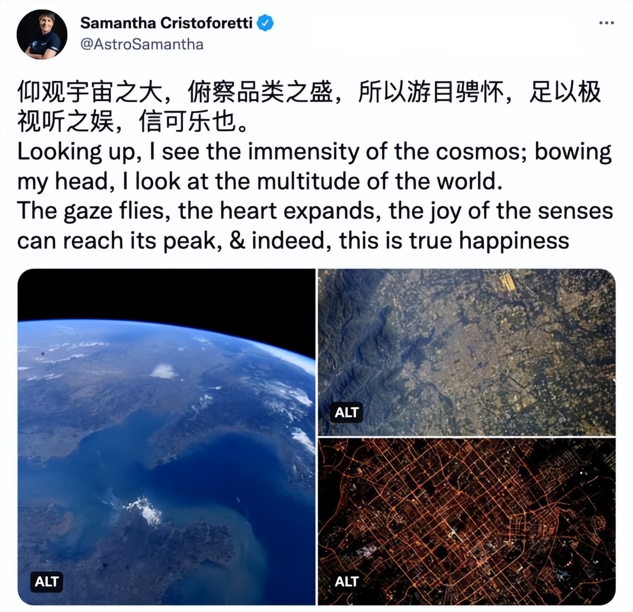 2022年的时候,意大利航天员萨曼莎·克里斯托福雷蒂,在国际空间站上,遥望地球的时候,忍不住引用中国名篇《兰亭集序》抒发感慨:“仰观宇宙之大,俯察品类之盛,所以游目骋怀,足以极视听之娱,信可乐也。”同样也是在浩渺宇宙的震撼之下,激发了她对地球家园的深切眷恋。