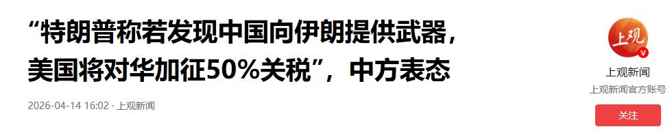 “特朗普称若发现中国向伊朗提供武器,美国将对华加征50%关税”,中方表态——2026-04-14 16:02·上观新闻