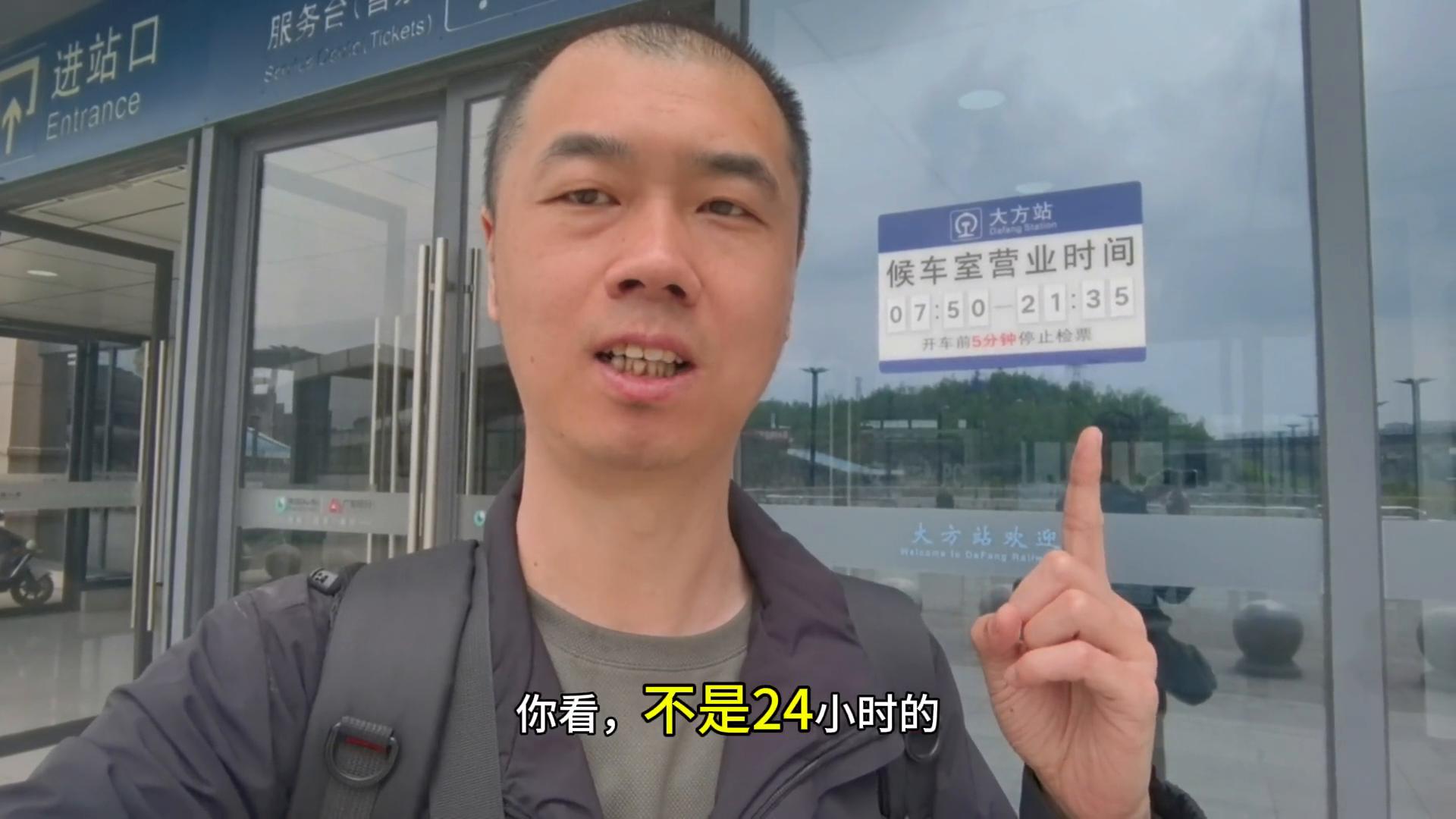 我订的住宿在大方汽车站附近,刚好这边有公交车直达,走公交绿色出行。大方站的候车时间不是24小时的,早上7:50到晚上的21:35。大方高铁站出站口正好就有1路公交车到大方客运站。现在是我在高铁站,这里是始发站。我买了份炸土豆,5块一份,满满的一大碗,5块钱。