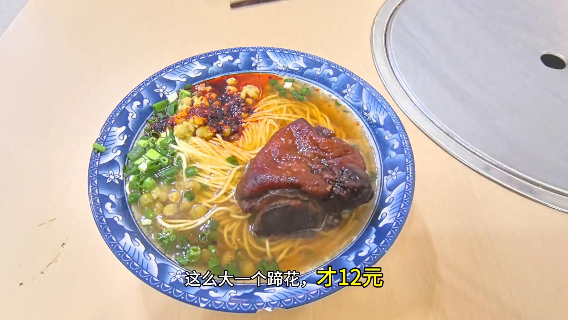 今天我要退房了,去大方了,再住两天。在临走以前我再去吃蹄花面,挺好吃的,而且关键是价格也很便宜。小碗的12,大碗的才13。蹄花面、大排面、肥肠面都是大碗吃饭。我今天要的小碗,小碗的感觉分量也不小,这么大一个蹄花才12。在我们山东不说别的,就光猪蹄最少就得20,还不带面条。