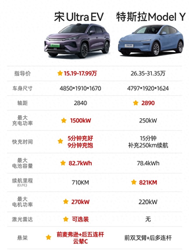 特斯拉Model Y卖得好,是因为它几乎没有短板。但现在比亚迪宋Ultra EV来了,价格更亲民(15.19万-17.99万),并且专攻纯电最大痛点——充电。第二代刀片电池+闪充技术,常温9分钟从10%到97%,冬天也不怕。续航710km,可选激光雷达,还有前排远端气囊、哨兵模式等安全配置。Model Y的极简和驾驶乐趣依然迷人,宋Ultra EV则用“闪充+大空间+低门槛”打动了更多家庭用户。两车各有绝活,你更在意什么?#B级纯电SUV怎么选 #宋Ultra EV #特斯拉Model Y