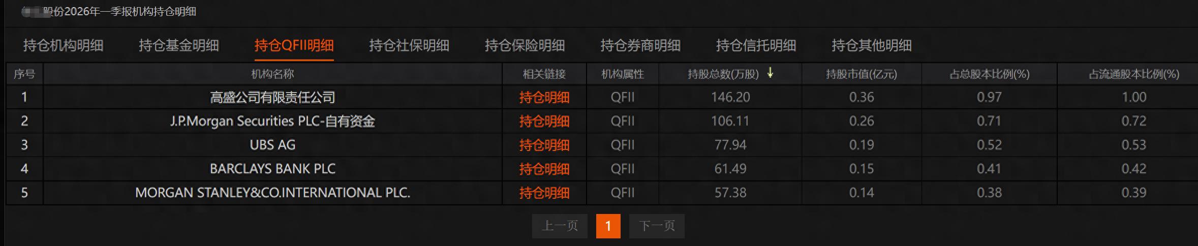 近期,随着 2026 年一季报密集披露,QFII(合格境外机构投资者)的最新持仓路线图彻底引爆市场。其中,一家油气高端装备赛道标的,一次性吸引了高盛、摩根大通、瑞银、巴克莱、摩根士丹利五大全球顶级投行集体进驻。