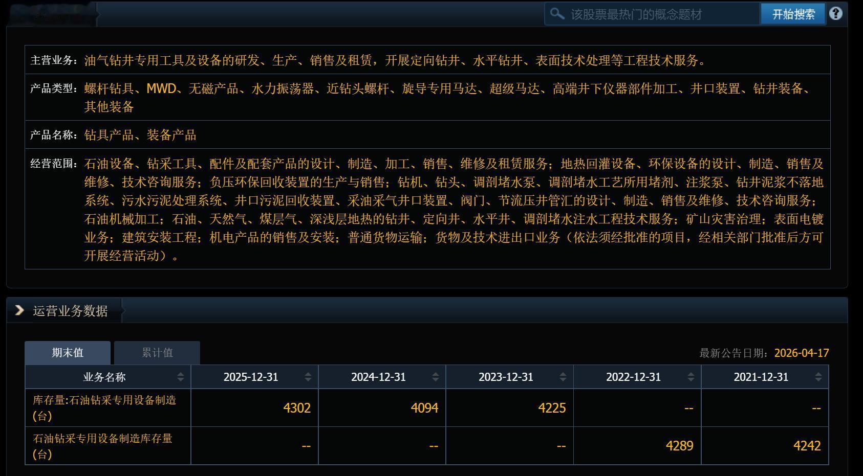 核心业务:能源细分赛道隐形龙头,技术壁垒拉满该标的聚焦石油、天然气钻井与开采高端专用设备赛道,主打井口设备、井下工具、油气开采智能系统等核心产品,是国内少数具备全套自主研发、生产、出口能力的民营油气装备龙头。