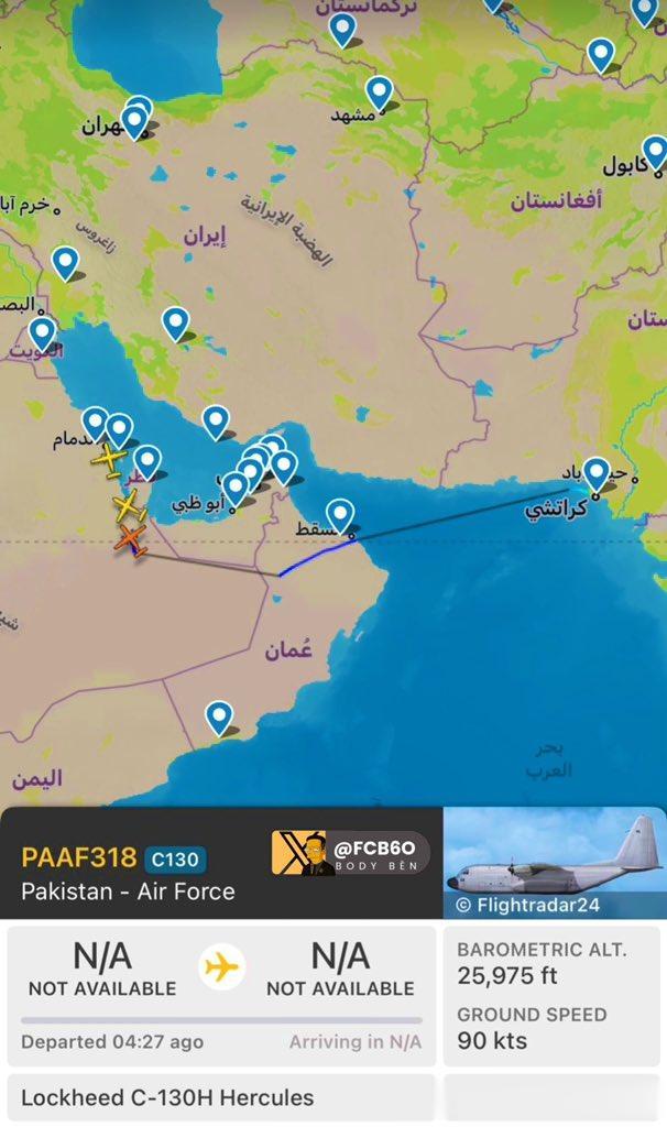 据称在巴基斯坦空军的保护下,伊朗代表团抵达卡拉奇,开始向伊斯兰堡飞去